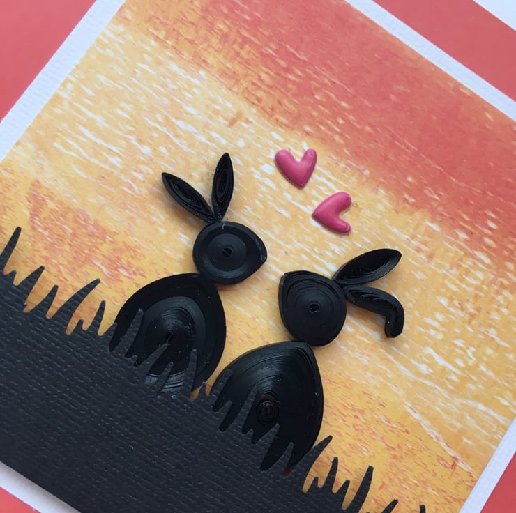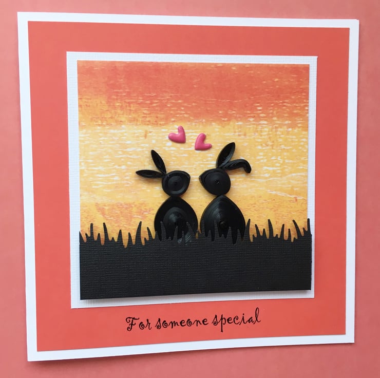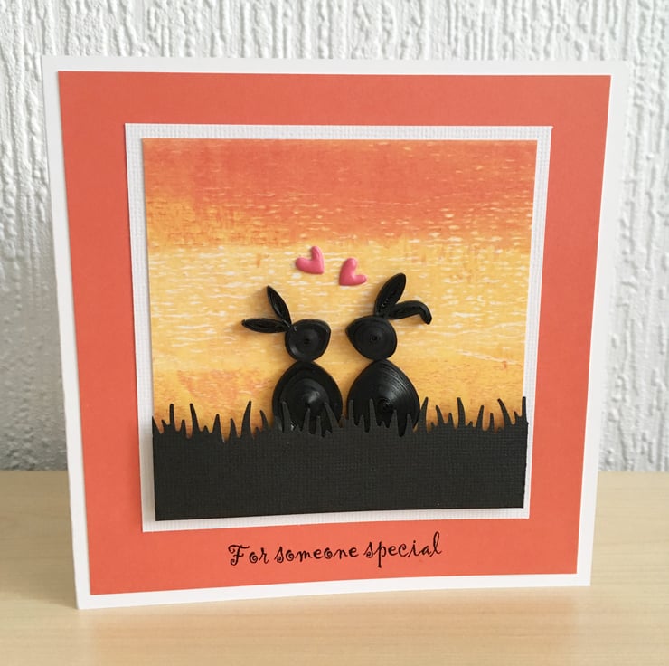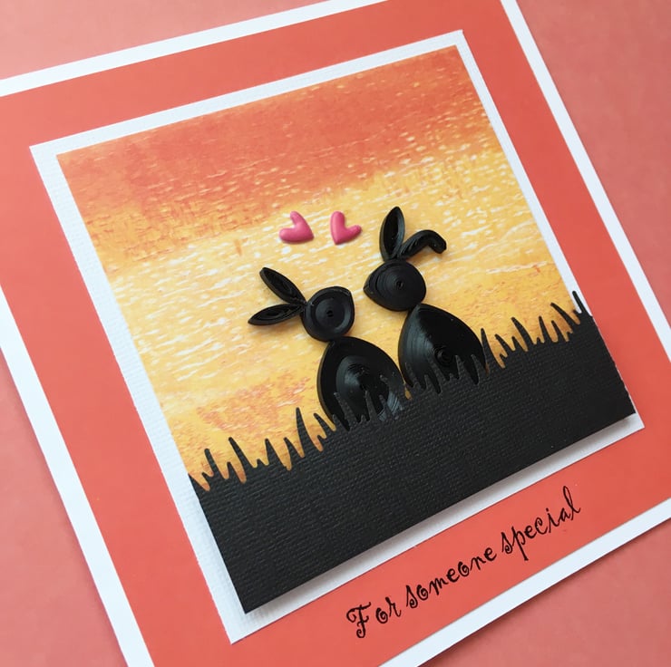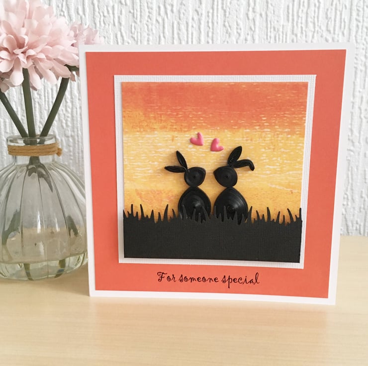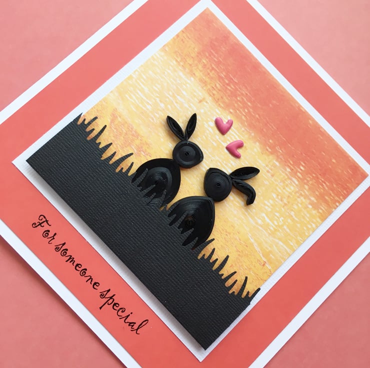 This adorable quilled card has two rabbits watching the sunset together and is perfect for Valentine’s Day, an Anniversary or Birthday as the greeting reads “For someone special”..