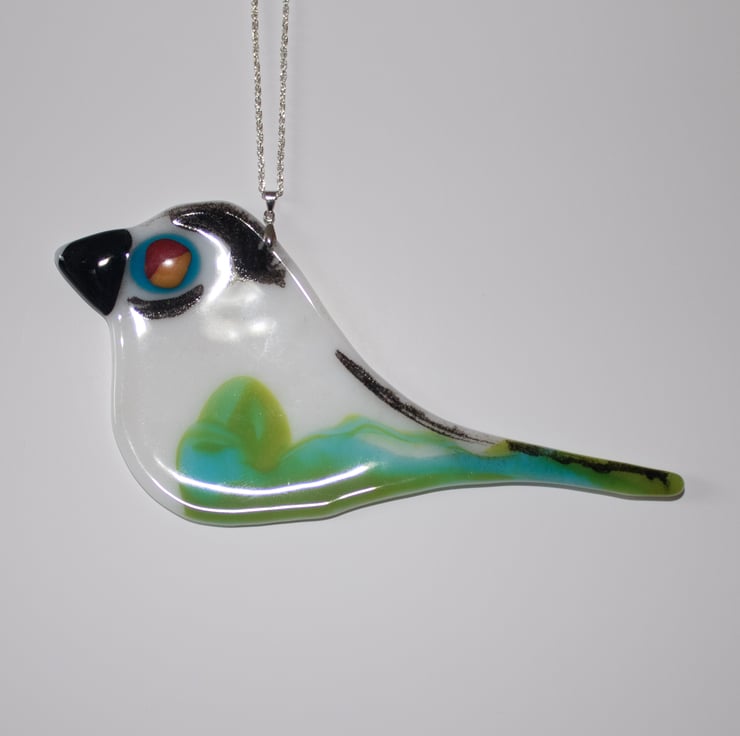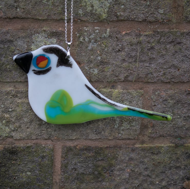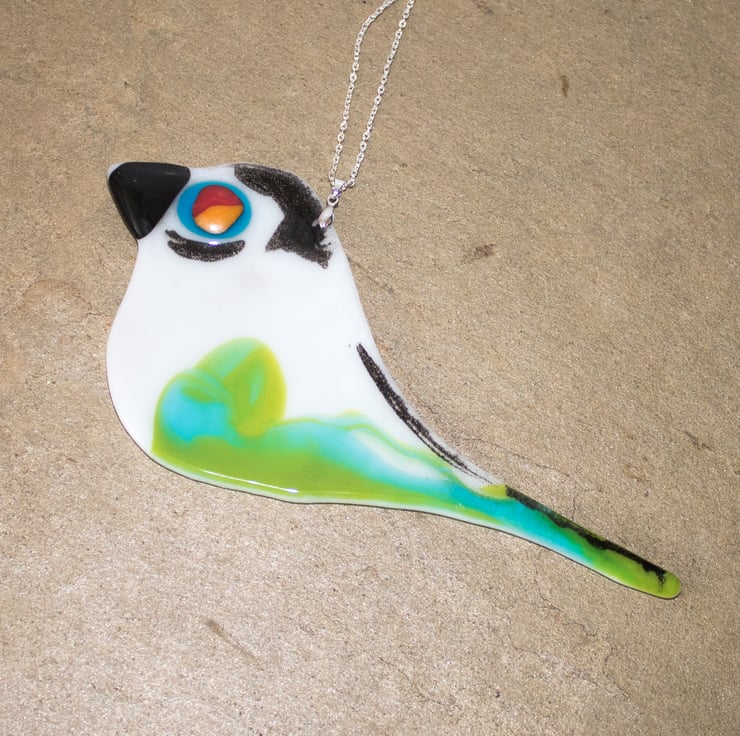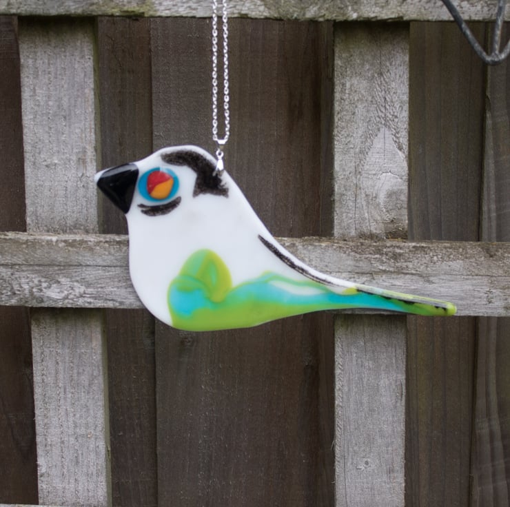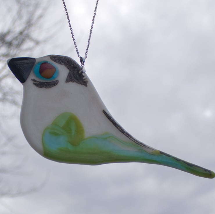 He's made from a single piece of hand-cut, white glass that has green streaks embedded within it. His beak is made from a triangle of black glass, and his multi-coloured eye is made from a pre-fused glass dot.