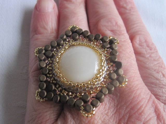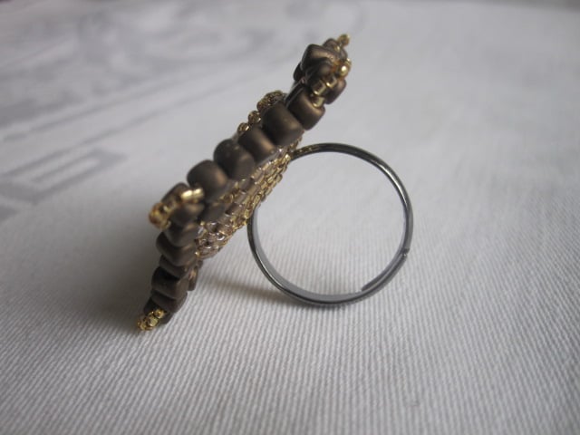This lovely beadwork ring is made using an Italian glass cabochon, small French cylinder beads and Japanese delica nd seed beads. It has a 6 pointed star shaped design with an adjustable black coloured ring fitting. The main section of the ring measures approx. 4.3cm in diameter and the inside diameter of the ring fitting is around 1.7cm. This ring will come gift boxed.