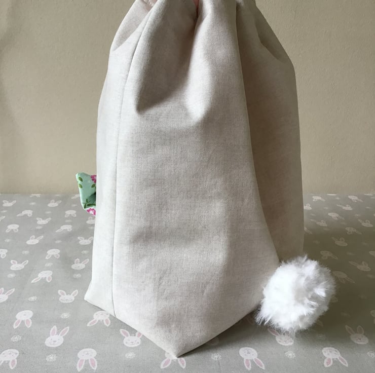 The Cottontail Bag measures approximately 10" x 10" with a 4" box bottom, she has a pretty bow and a fluffy tail.