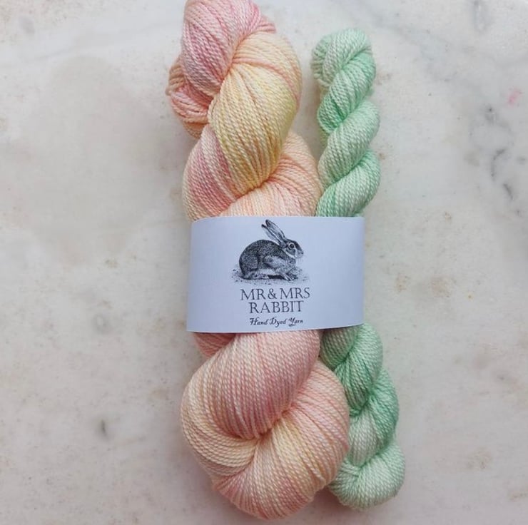 The Cottontail Sock Set is comprised of one 100g skein and one 20g mini of Mrs Rabbit's luxurious signature yarn. A deluxe high twist sock weight, with a blend of 85% Superwash Extrafine Merino & 15% Nylon with approximately 360m per 100g skein.