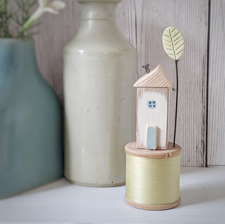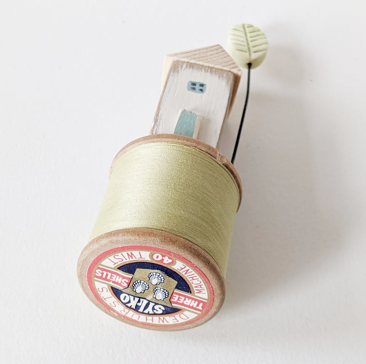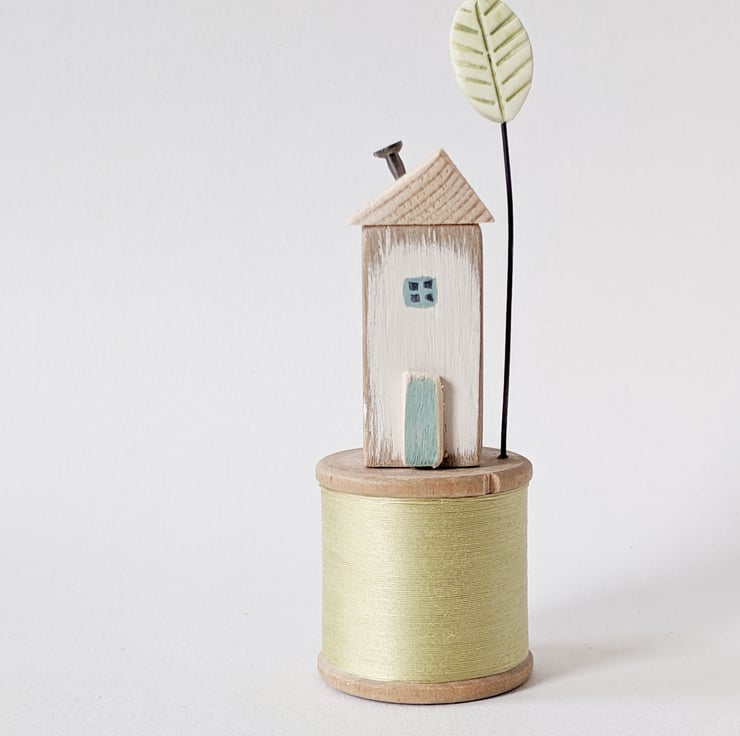 I love finding these old bobbins on rummaging trips! The tiny homes perch happily on top.