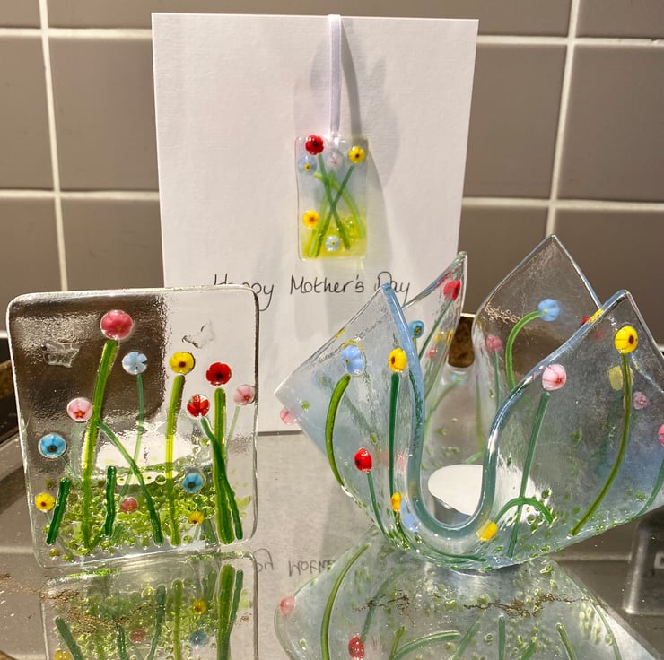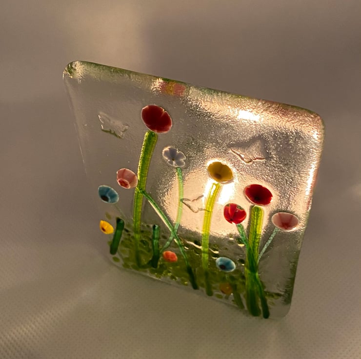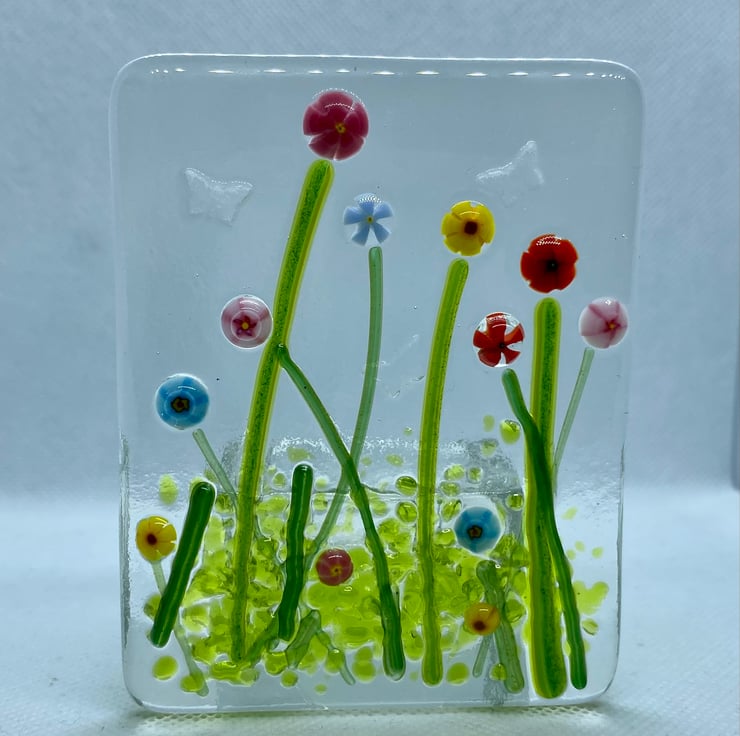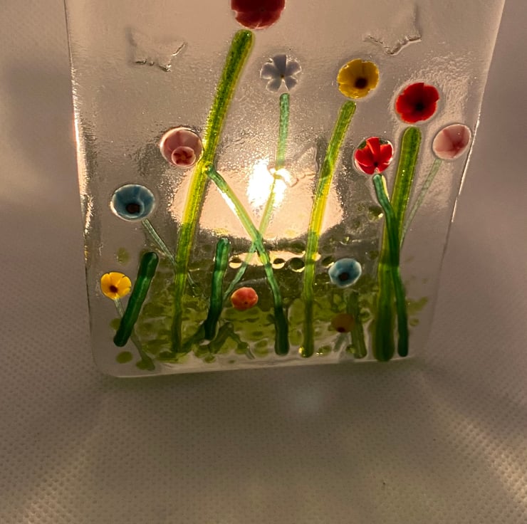 This fused glass tea-light shade features a patch of colourful little flowers and green stems and grass and there are also three little butterflies etched into the back of the glass.