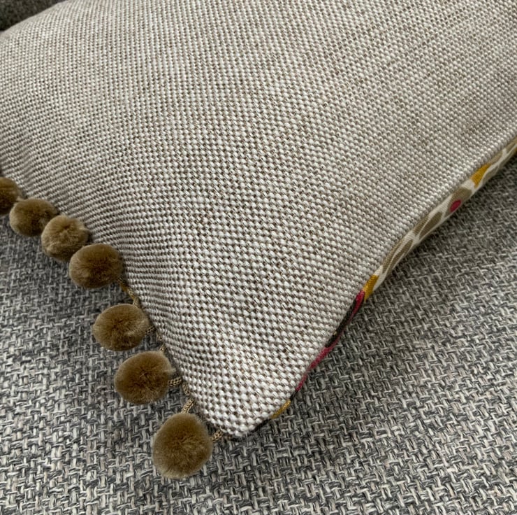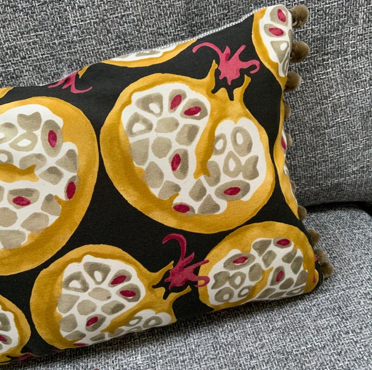Sanderson Pomegranate by Emma Bridgewater cotton front, beige woven back. Velvety Pom Pom trim. Zip fastening