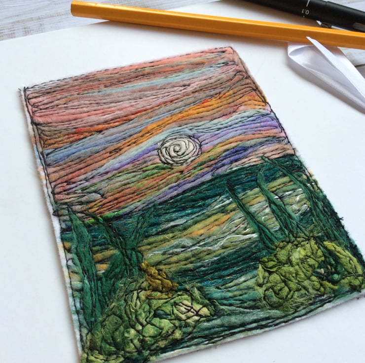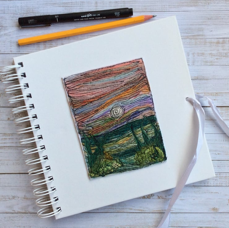 This square sketchbook has heavy duty white paper pages and an embroidered card cover. It’s enhanced with an original needle felting wool free motion embroidery of a sunset landscape. It’s ideal for putting special photos in, journaling, painting, scrap booking or drawing. The spiral bound sketchbook is made with 200gsm white paper and a strong white cover which measures 19.5 x 19.5cm (8”), and contains 40 pages (80 sides). The cover is held closed by a white ribbon to keep contents safe and tidy. The artwork measures 9.5 x 12.5cm.
