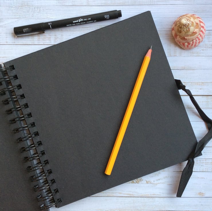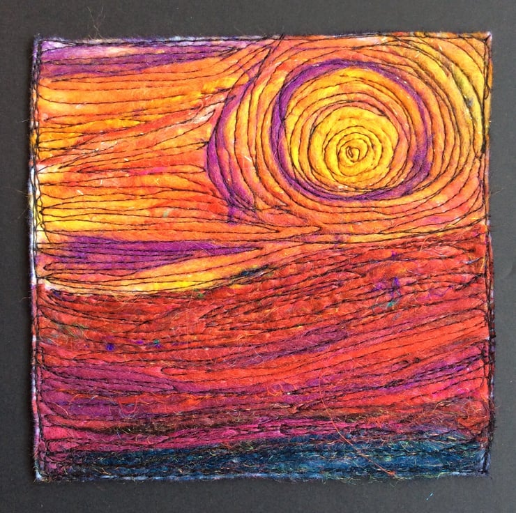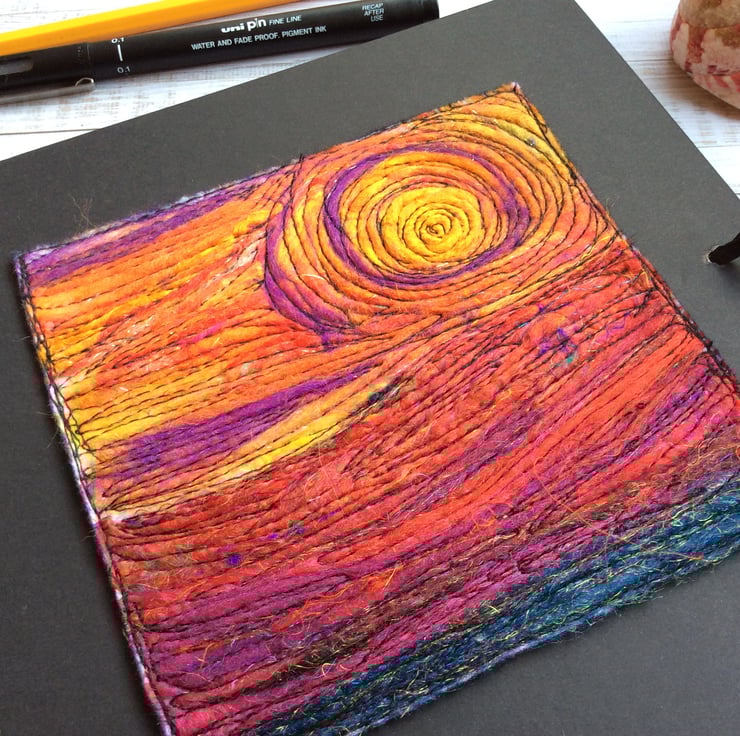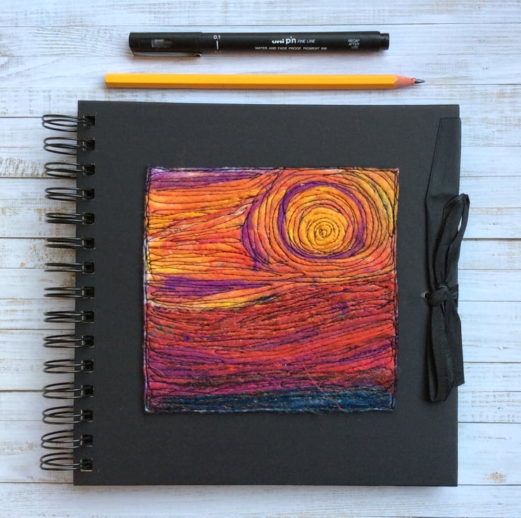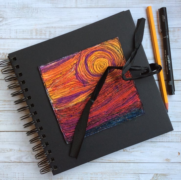 This square sketchbook has black card pages and an embroidered cover. It’s enhanced with an original needle felting free motion embroidery of a sunset landscape. It’s ideal for a photo album, journaling, painting, scrap booking, drawing or any art project. The spiral bound sketchbook is made with 200gsm black card and a strong black cover which measures 19.5 x 19.5cm (8”), and contains 40 pages (80 sides). The cover is held closed by a black ribbon to keep contents safe and tidy. The artwork measures 12.5 x 13cm.