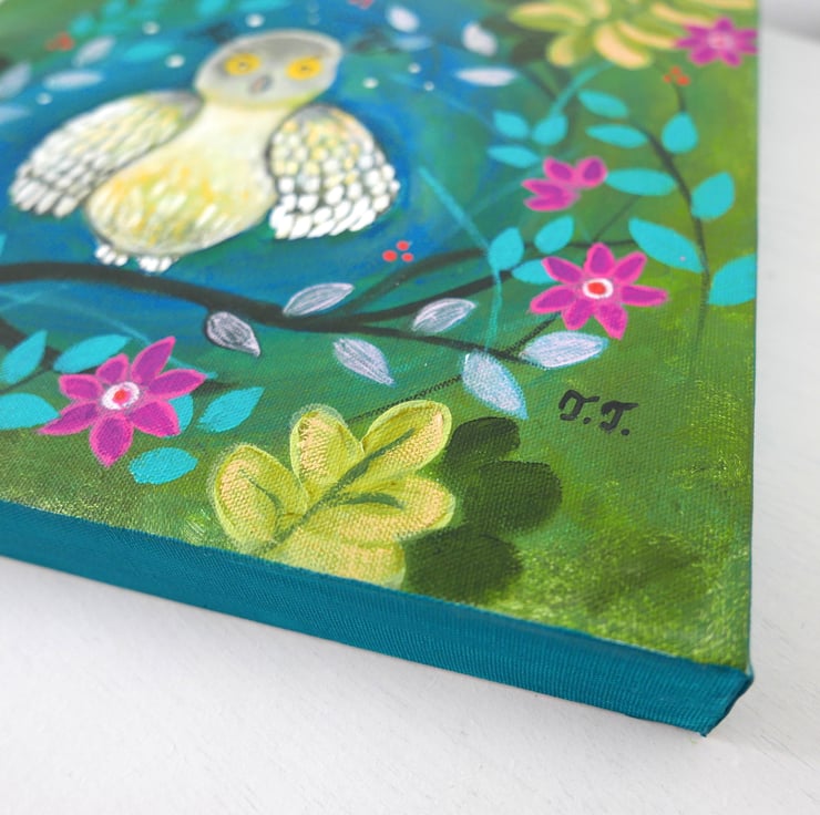 This is an original painting featuring an owl surrounded by nature with trees, leaves pattern and flowers against a green and teal background. The artwork is painted on the edges in forest green, it is varnished for protection and ready to hang. The owl has two little lyres for ears, my signature feature that can be found in other artworks.