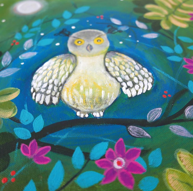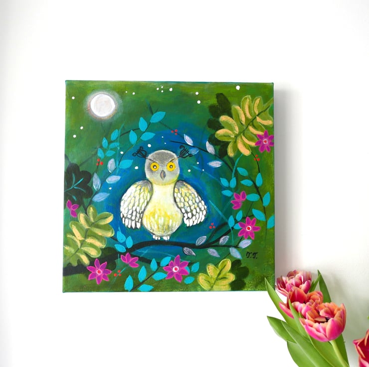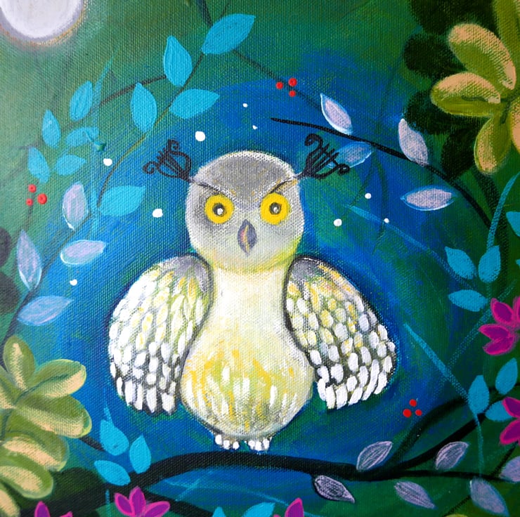 This is an original painting featuring an owl surrounded by nature with trees, leaves pattern and flowers against a green and teal background. The artwork is painted on the edges in forest green, it is varnished for protection and ready to hang. The owl has two little lyres for ears, my signature feature that can be found in other artworks.
