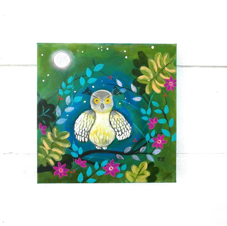 Owl Painting, Naive Animal Art, Original Nature Artwork