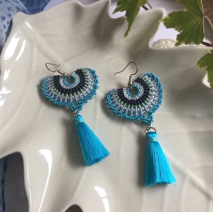 I have created these earrings using the intricate art of macrame. The colours I have chosen for this design shades of blue with a hint of grey and pale green . The fan shape is formed around a central jump ring to which I have attached a hyper allergenic earring wire for pierced ears.