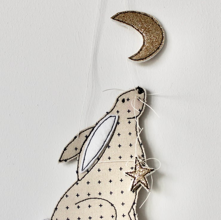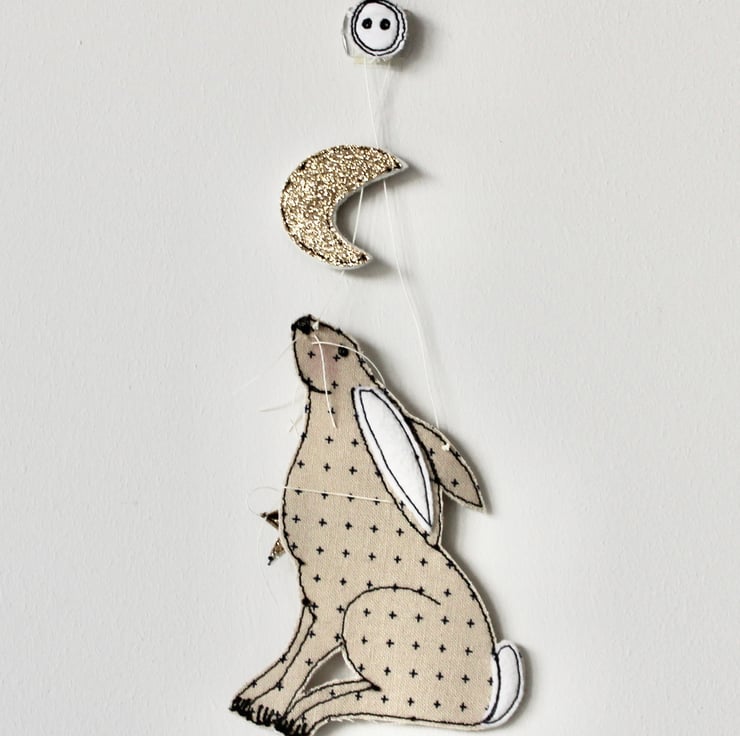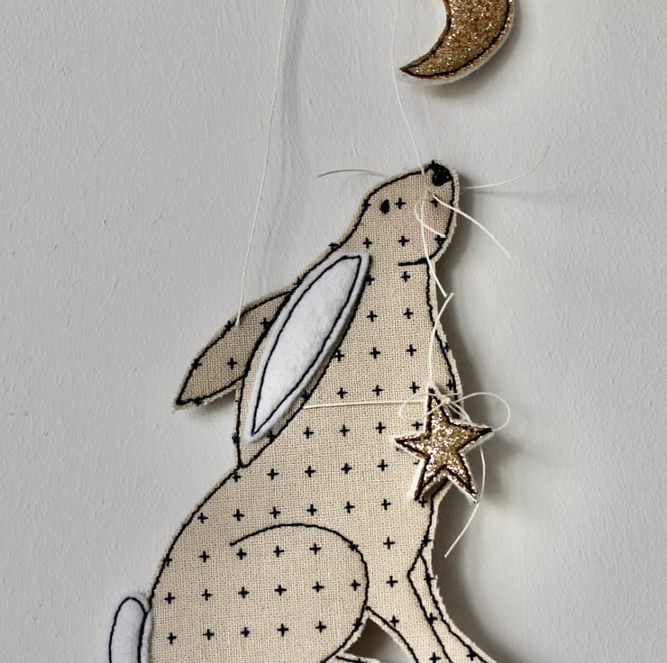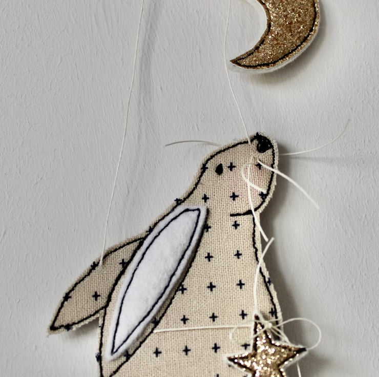 Little hare and the golden glittery moon are sewn using 100% wool felt, glitter cloth, beige cotton cloth printed with navy blue coloured crosses (or as I like to think of them kisses) and free hand machine embroidery; multiple layers of cloth are sewn together and cut out by hand using sharp scissors. With linen whiskers and a linen string to suspend.