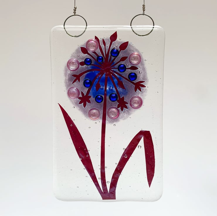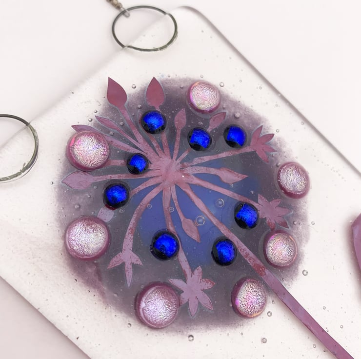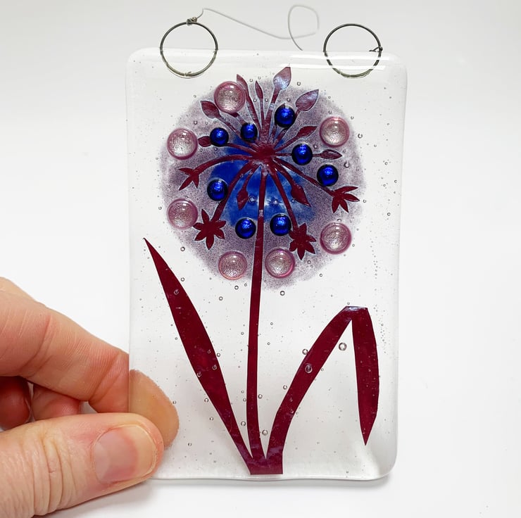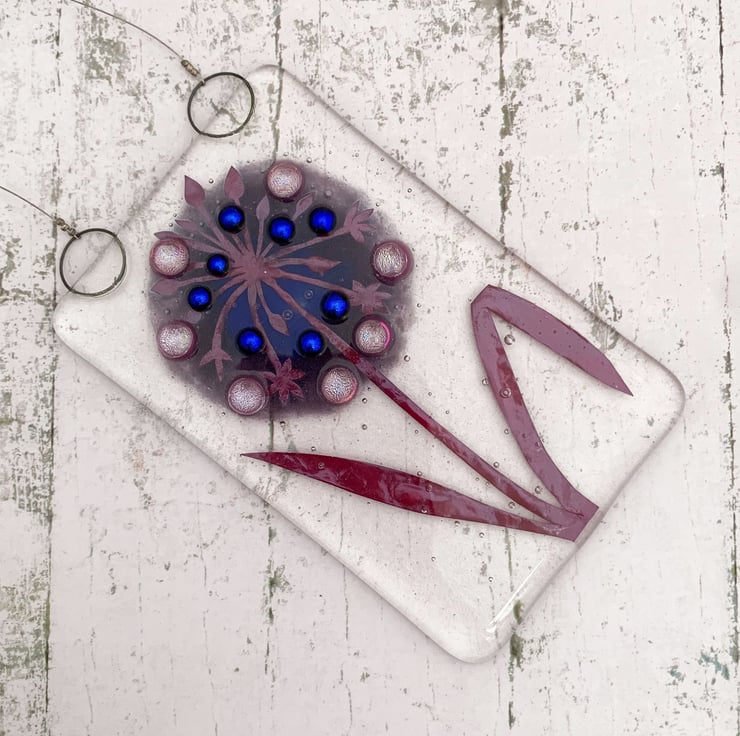 Fused glass hanging agapanthus inspired suncatcher, in shades of purple, blue and maroon. This would make a beautiful gift for a special friend and looks lovely in a window.