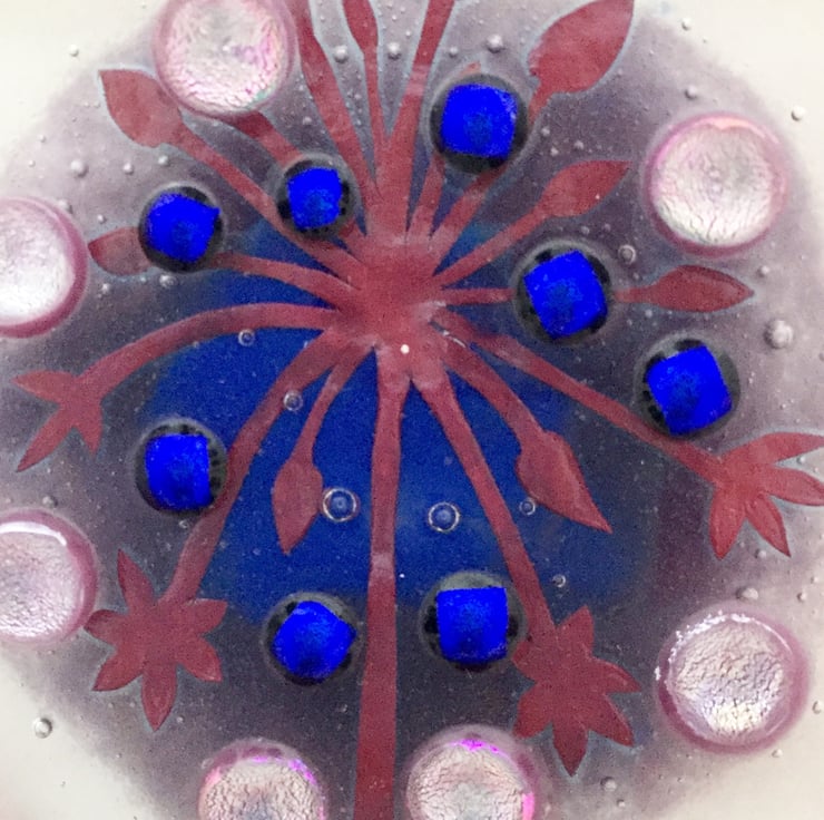 To make this fused glass hanging, I cut 2 rectangles of transparent art glass. I then hand cut copper foil with a scalpel to make the agapanthus shape. I stencilled purple and blue powdered glass on to one of the rectangles to make the head of the flower and carefully arranged the copper between the layers of glass. The whole piece was fused overnight. The copper turns a rich dark red in the heat of the kiln. Next, I added coloured and dichroic dots which I have made previously to give some added interest to the design. A second firing is done overnight the next day to tack fuse the dots onto the design, so that they stand proud of the glass, giving it a 3D effect.