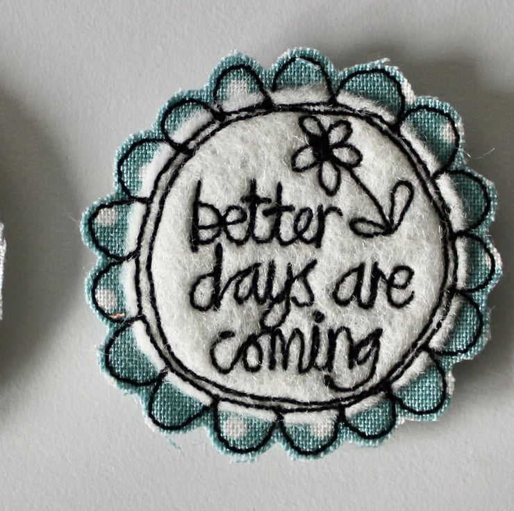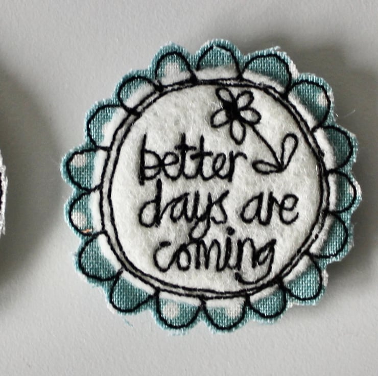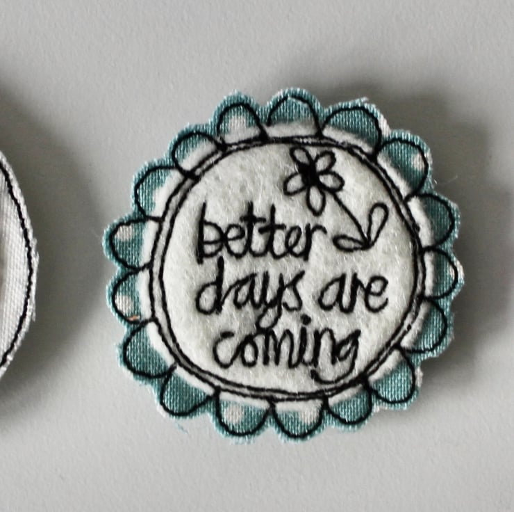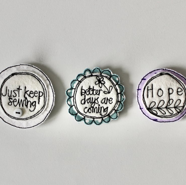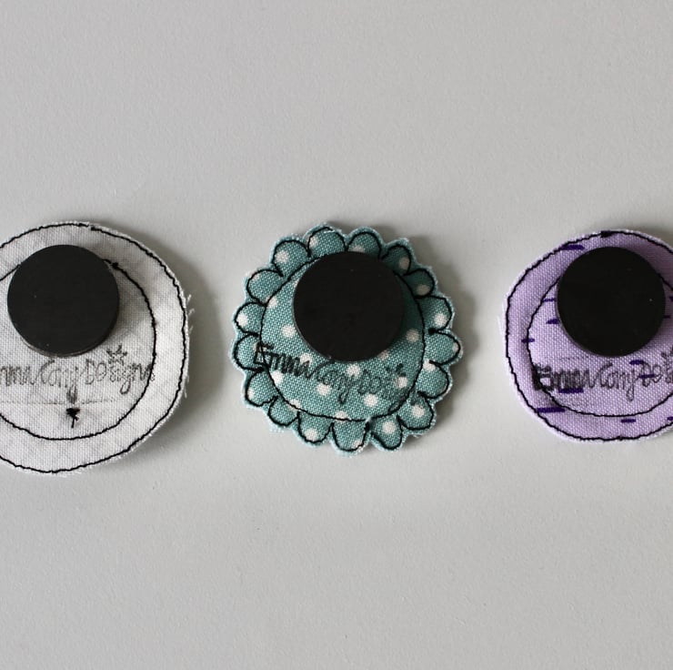 Each magnet is created using multiple layers of cloth, sewn using freehand machine embroidery and then cut out by hand. The magnet on the back is attached with hot glue.