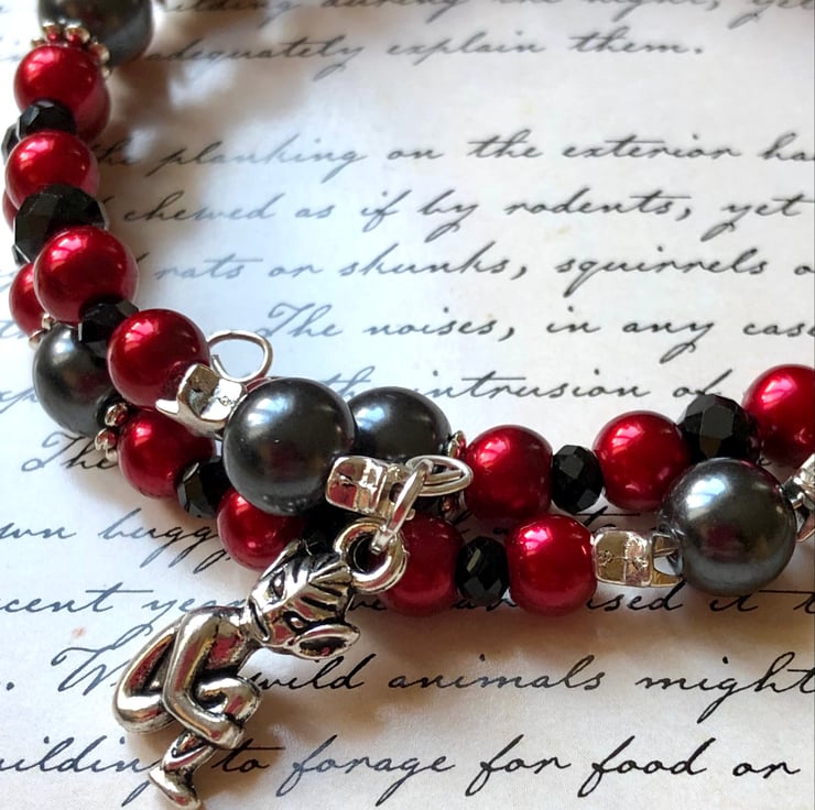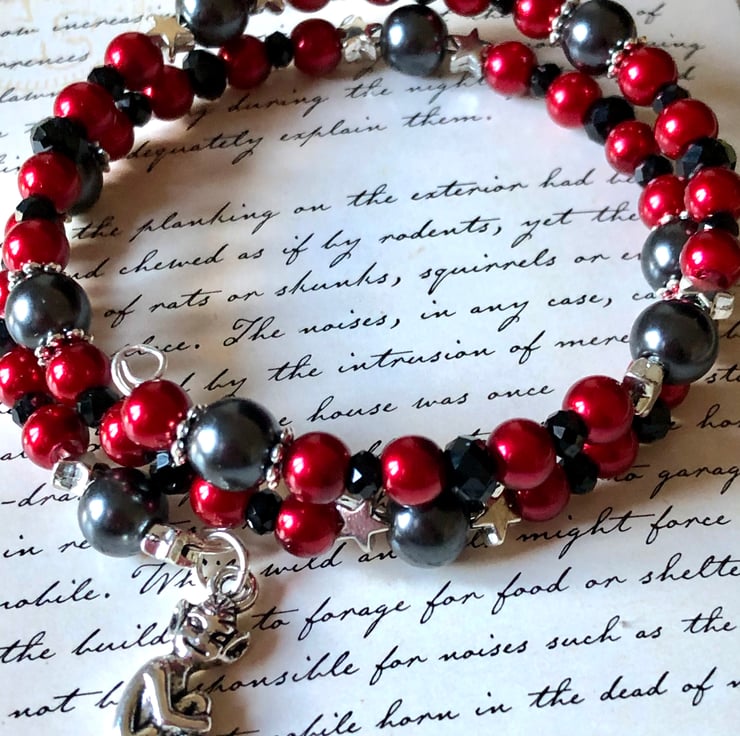 I have added lovely shiny red and black pearl beads and dainty silver star spacers.