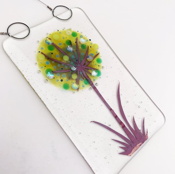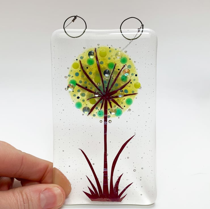 Fused glass hanging allium inspired suncatcher, in shades of greens. This would make a beautiful gift for a special friend and looks lovely in a window.