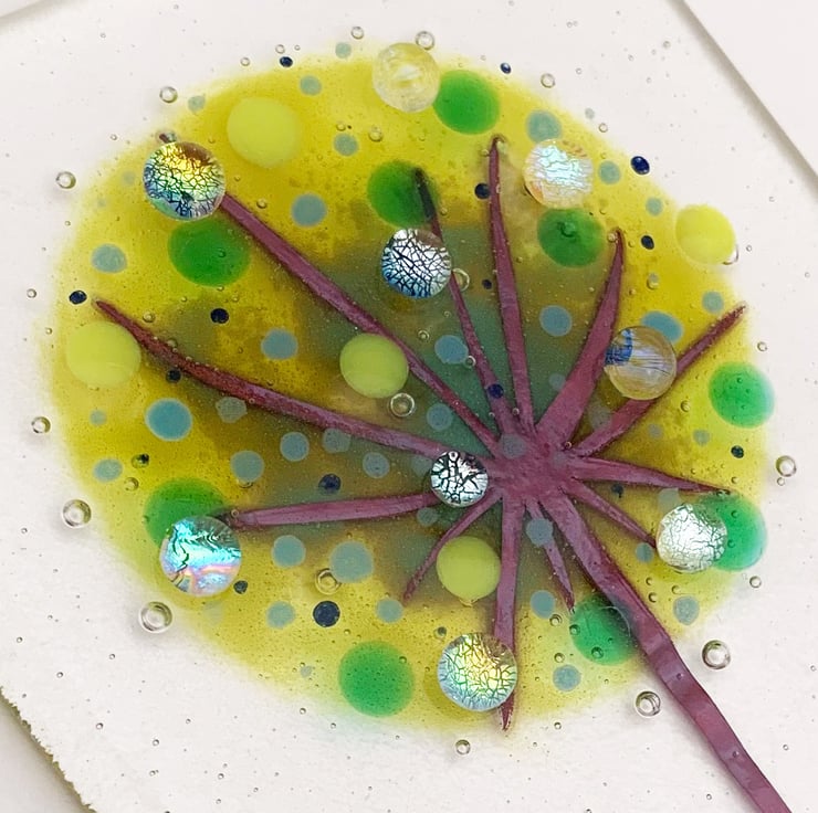 To make this fused glass hanging, I cut 2 rectangles of transparent art glass. I then hand cut copper foil with a scalpel to make the allium shape. I stencilled a mix of green powdered glass on to one of the rectangles to make the head of the flower and carefully arranged the copper between the layers of glass. The whole piece was fused overnight. The copper turns a rich dark red in the heat of the kiln. Next, I added handpainted enamel spots and coloured and dichroic dots which I have made previously to give some added interest to the design. A second firing is done overnight the next day to tack fuse the dots onto the design, so that they stand proud of the glass, giving it a 3D effect.