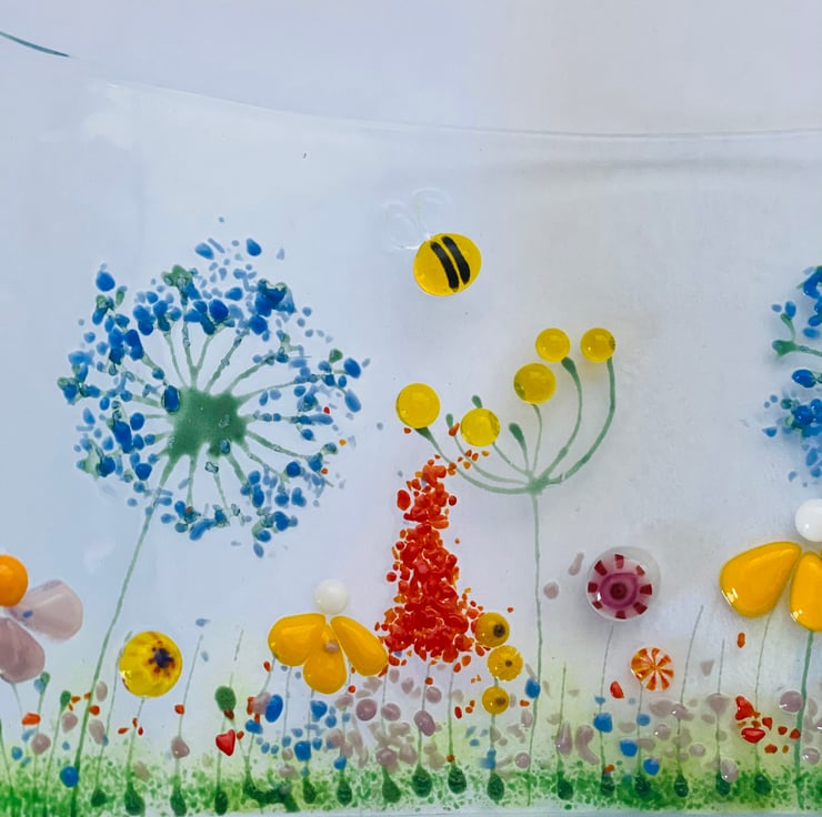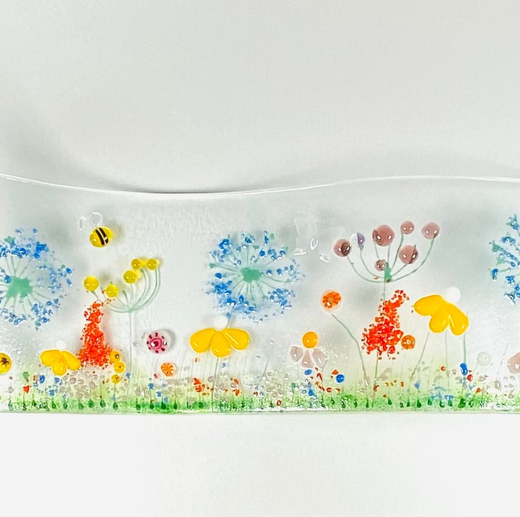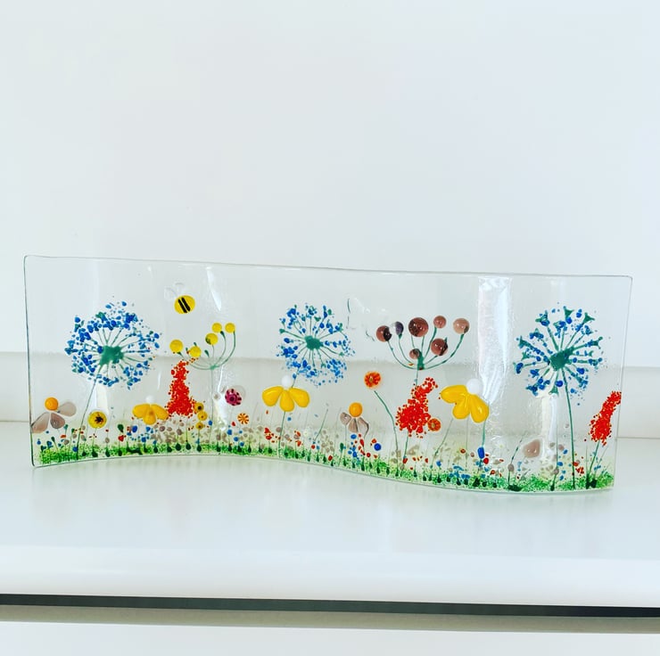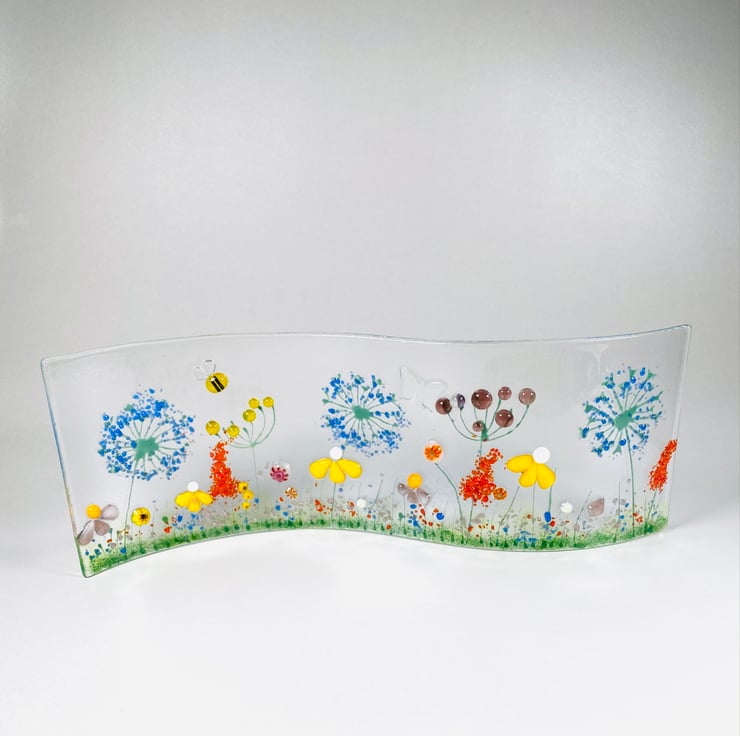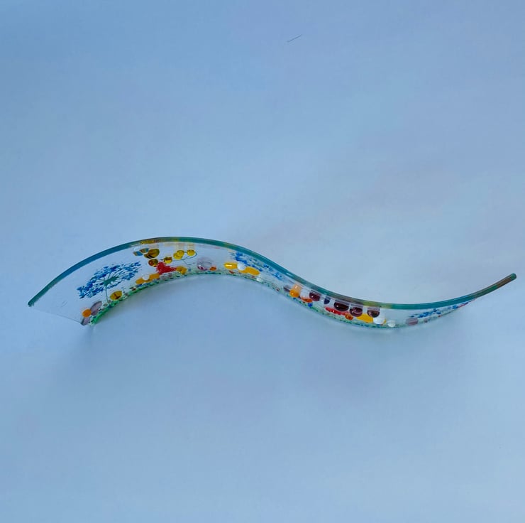Gorgeous freestanding wave ornament . Only one made at a time snd each is unique . This meadow features a glass bumble bee and a butterfly . Adds a splash of colour to your room . Lovely and colourful .