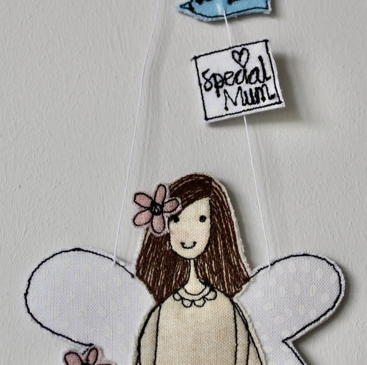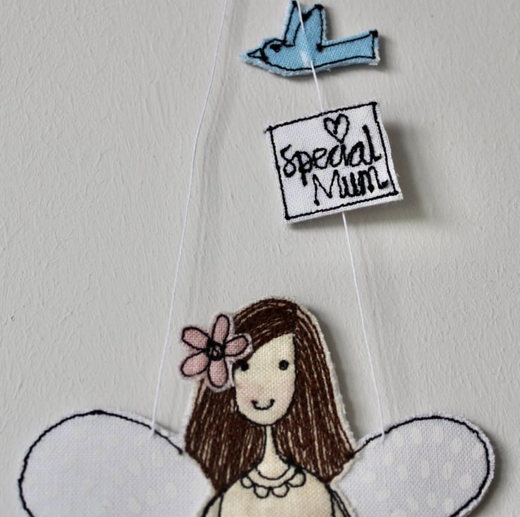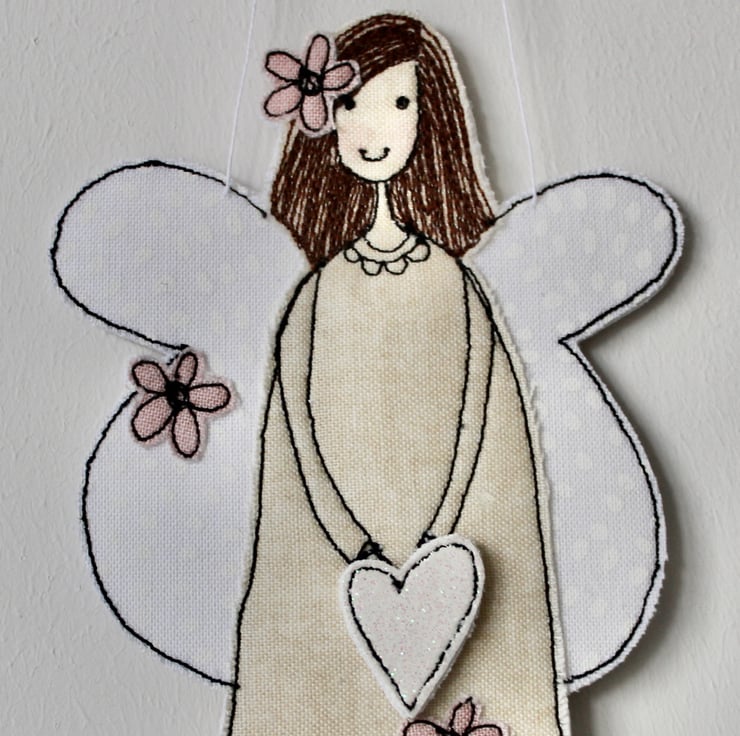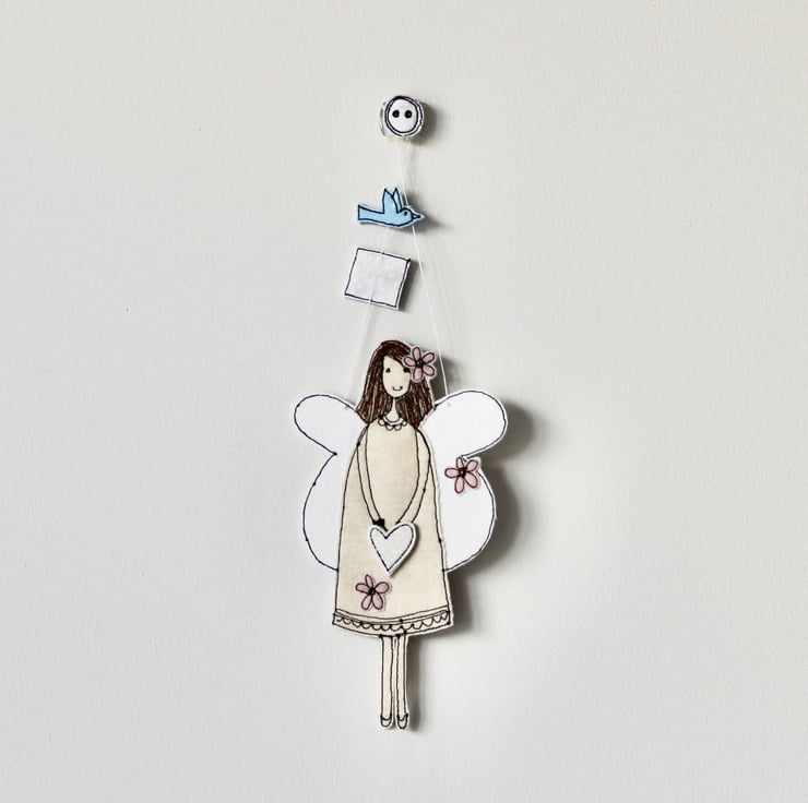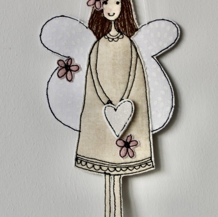 Each handmade fairy is sewn using cotton cloth, glitter cloth and free hand machine embroidery; multiple layers of cloth are sewn together and cut out by hand using very sharp scissors. With a linen thread to hang.