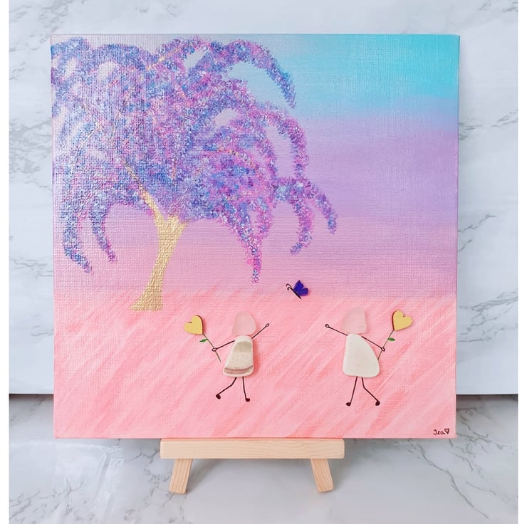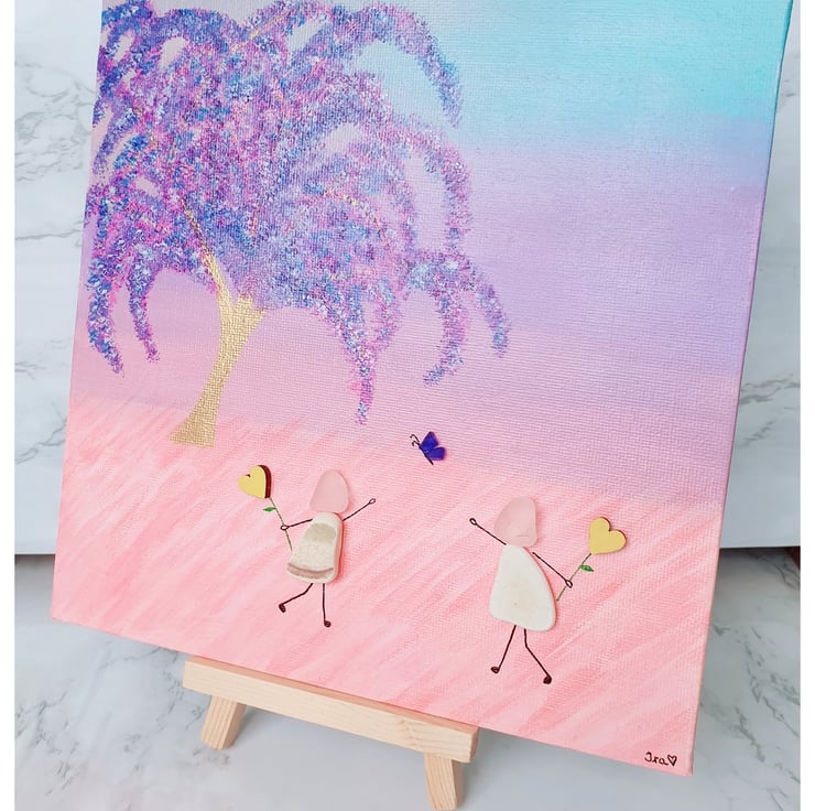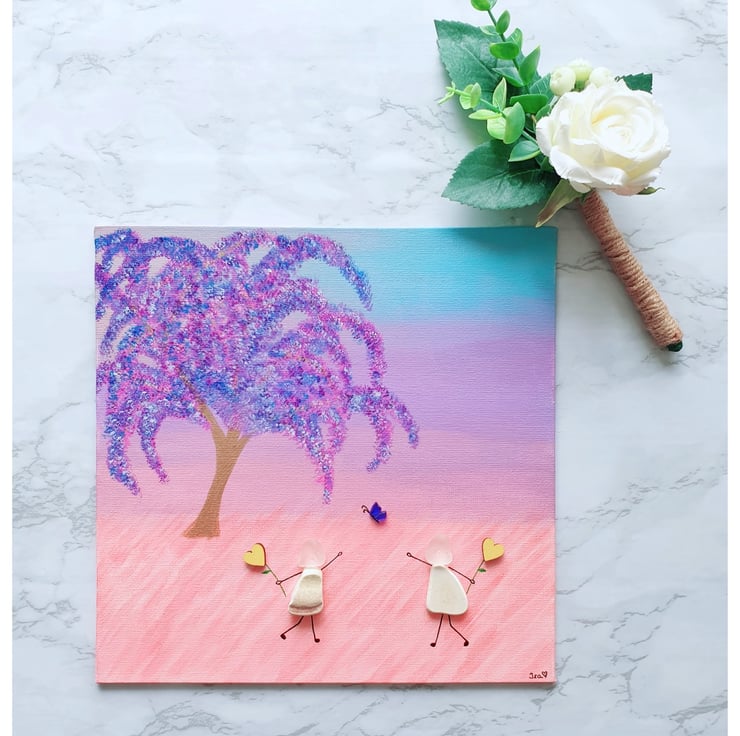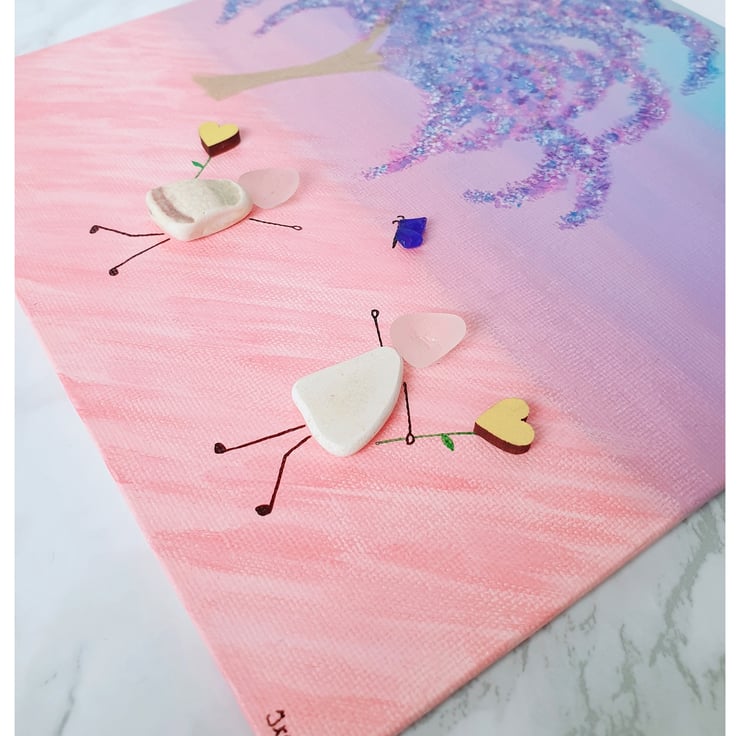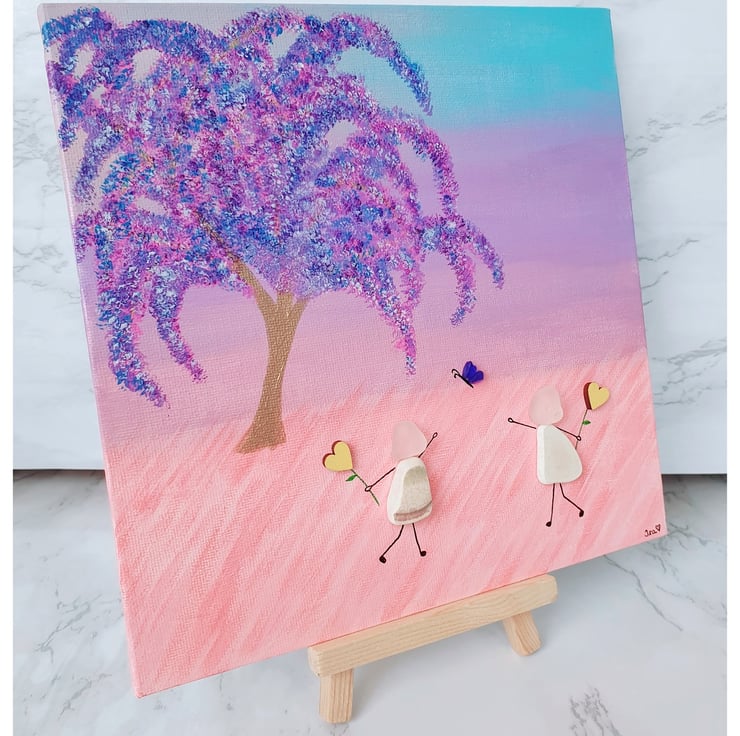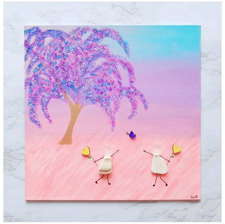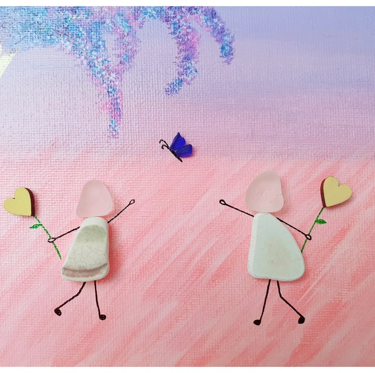 A whimsical piece depicting two friends enjoying a day out. This piece was created with seaglass, seapottery and wooden hearts on painted canvas.