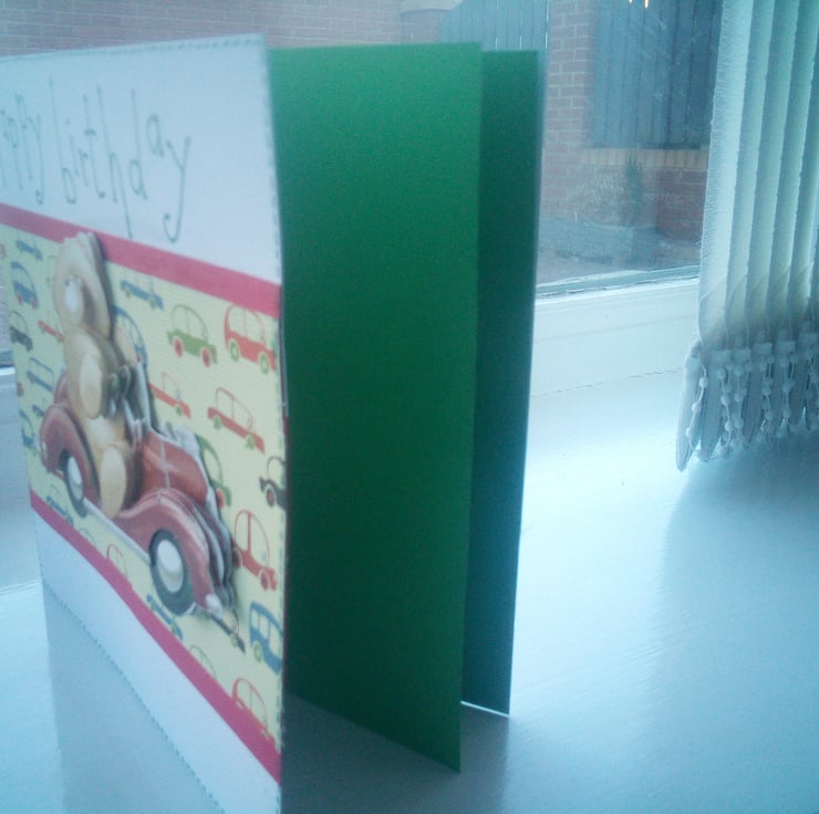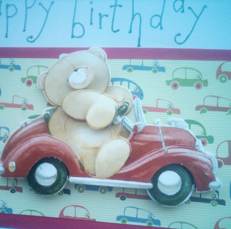A completely handmade and uniquely designed card. Consisting of a cute teddy driving decoupage mounted onto car patterned paper then red card then onto pristine white quality card. Finished off with happy birthday hand written in green ink.