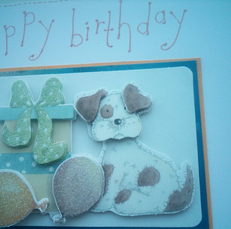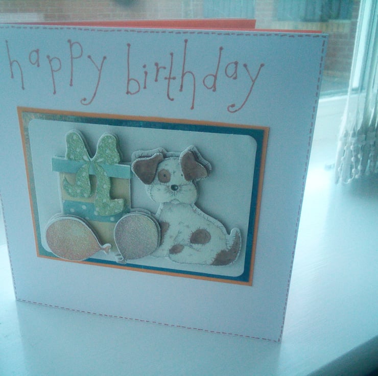 A completely handmade and uniquely designed card. Consisting of a decoupage of a dog with gift and balloons mounted onto holographic card, orange card then onto pristine white quality. Happy birthday hand written in orange ink