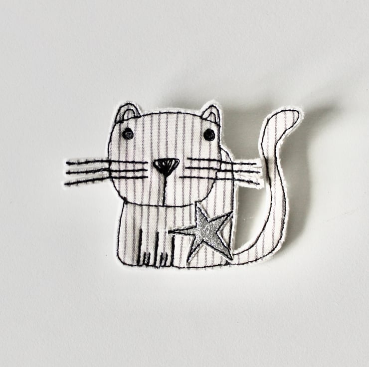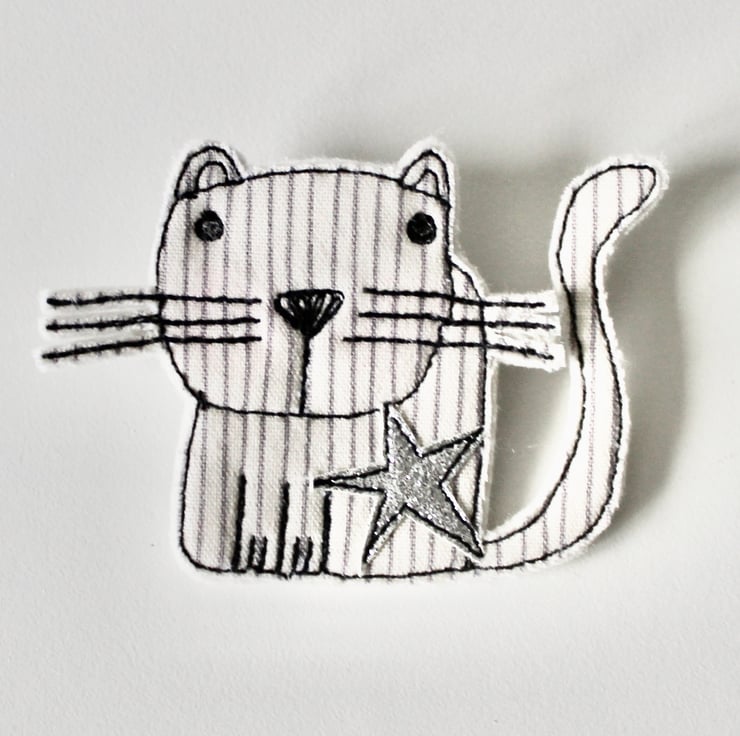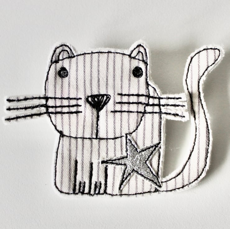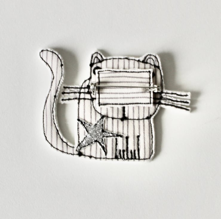 Each cat brooch is created using multiple layers of cloth, freehand machine embroidery and cut out by hand using very sharp scissors. The pin on the back is attached with hot glue and a sewn fabric rectangle to secure.