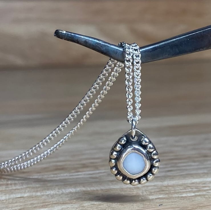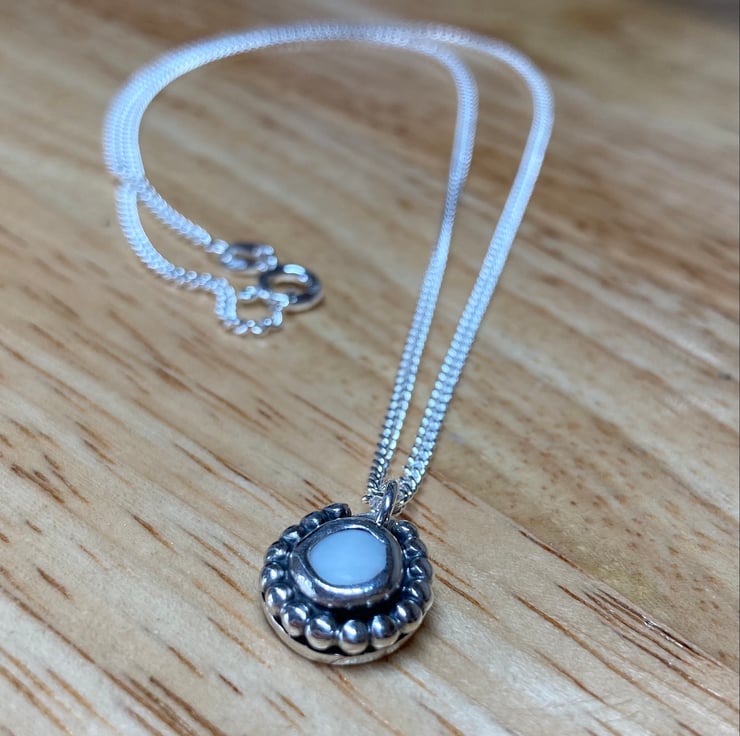 Stunning solid white piece of welsh sea glass collected from a beach in Wales and handset in fine and sterling silver with sterling silver beading. This gorgeous little pendant hangs on an 16’’ long 1.7mm thick sterling silver curb chain. Perfect gift for yourself or a loved one (alternative chains available in 16’’ & 20’’ please request upon ordering) Will come in a lovely white jewellery box which will be wrapped with twine and lavender.