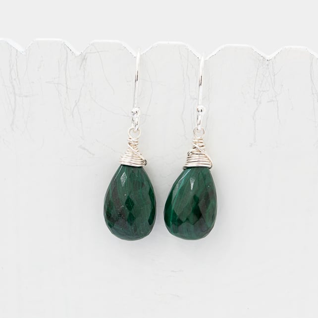 The forest green swirling layers in these AAA grade Malachite briolettes are absolutely typical of this gemstone and mesmerisingly beautiful. The rich dark green contrasts with the sterling silver wire, which has been wrapped by hand in Cornwall, in my studio overlooking Mount's Bay in the far West.