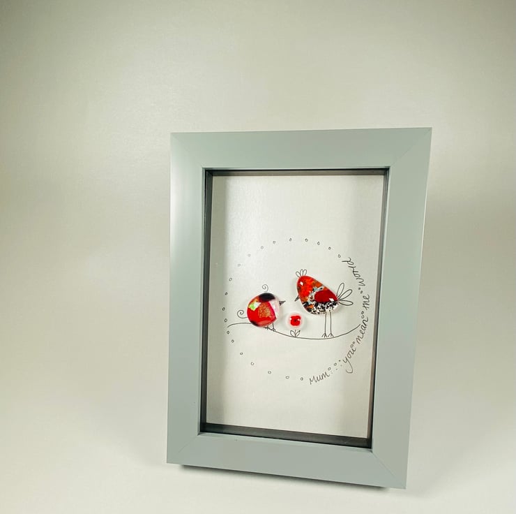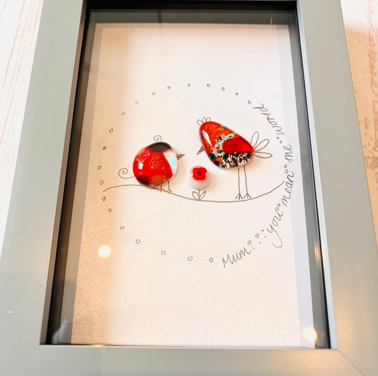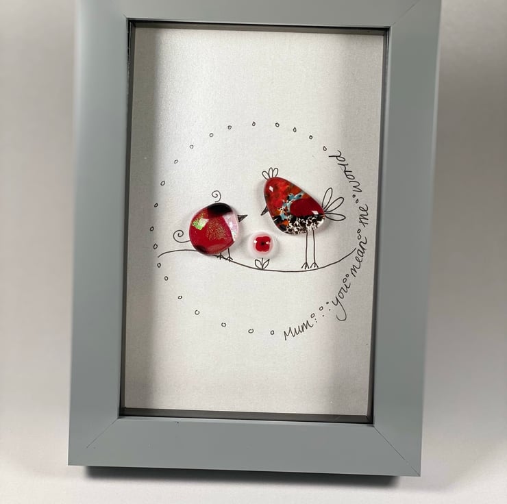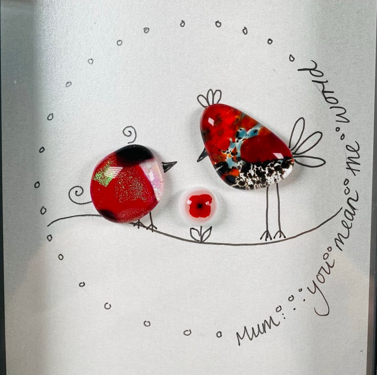 “Mum you mean the world “ dichroic glass birdies picture. Perfect gift for mums . The cute birds are created in my home studio kiln and there’s even a tiny glass flower !