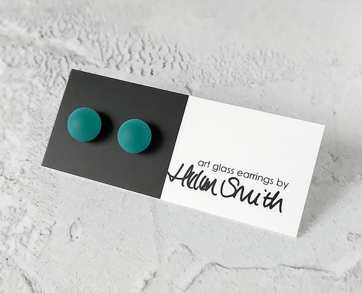 Stud earrings in matt teal green fused glass with sterling silver fittings, handmade by me in my home studio on the Wirral peninsula, NW England and presented on my signature card.
