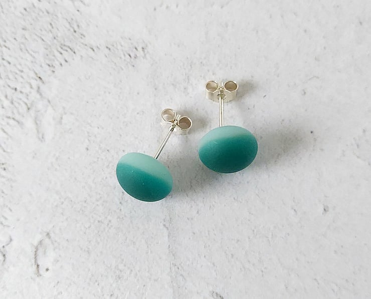 A pair of handmade fused glass stud earrings in a vivid teal green, with a smooth matt finish and sterling silver fittings.