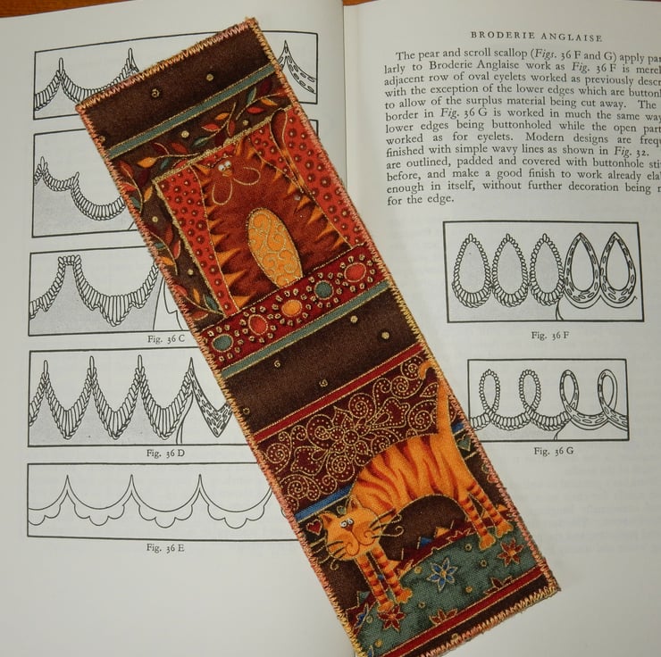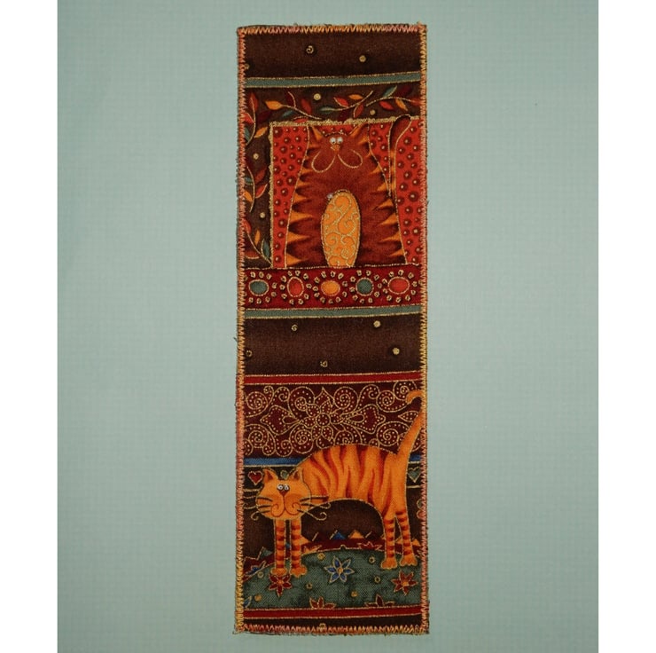 This bookmark would make an ideal small gift, it features two stylised ginger cats with a hint of gold. It measures 2.5 x 8 inches, and has a plain linen effect fabric on the reverse, and a layer of stiffening in between. The edge is stitched in variegated thread. It would be ideal to keep your place in your favourite novel.