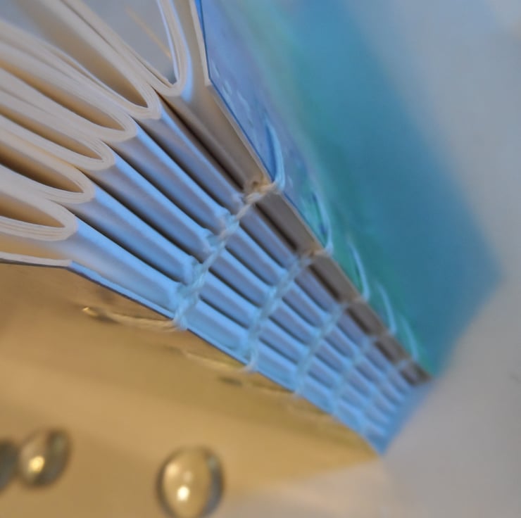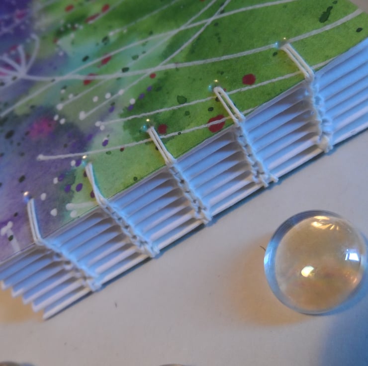 The book was handstitched together using Coptic stitch and white waxed linen thread. This style of binding (Coptic) allows the pages to open completely flat.