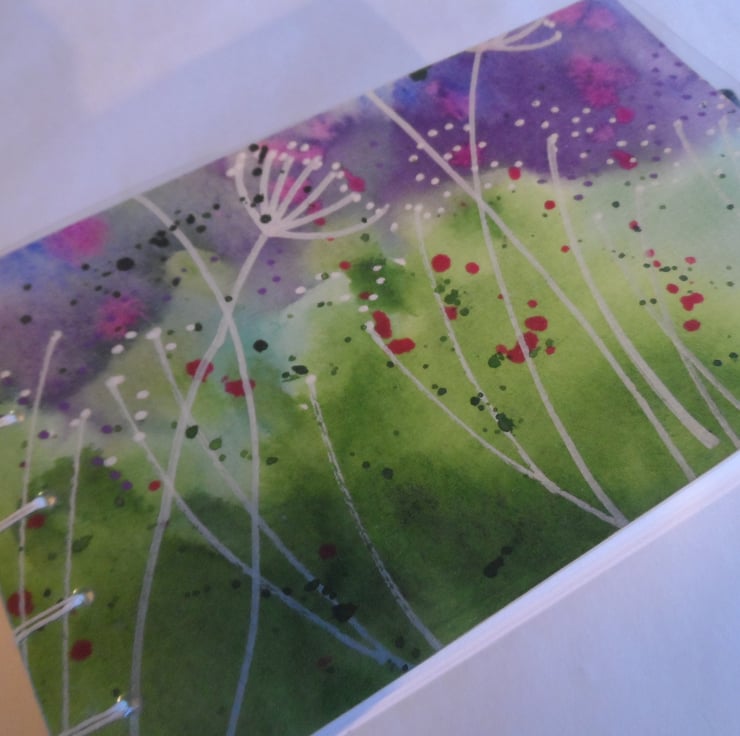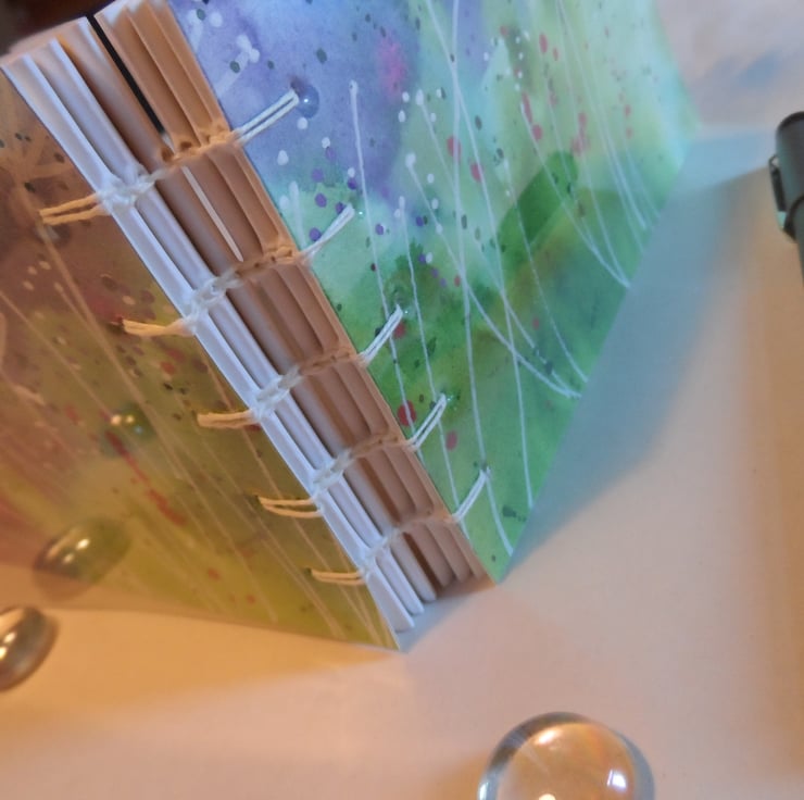 The covers of this book are an original hand painted watercolour painting on thick 350gsm watercolour paper and with additional paint pen detailing. I have cut the painting in half and used the halves on the front and the back covers so the image still lines up. The watercolour covers are protected with 2 pieces of acetate front and back which are bound into the book (this is what gives the shine you may be able to see on the covers).