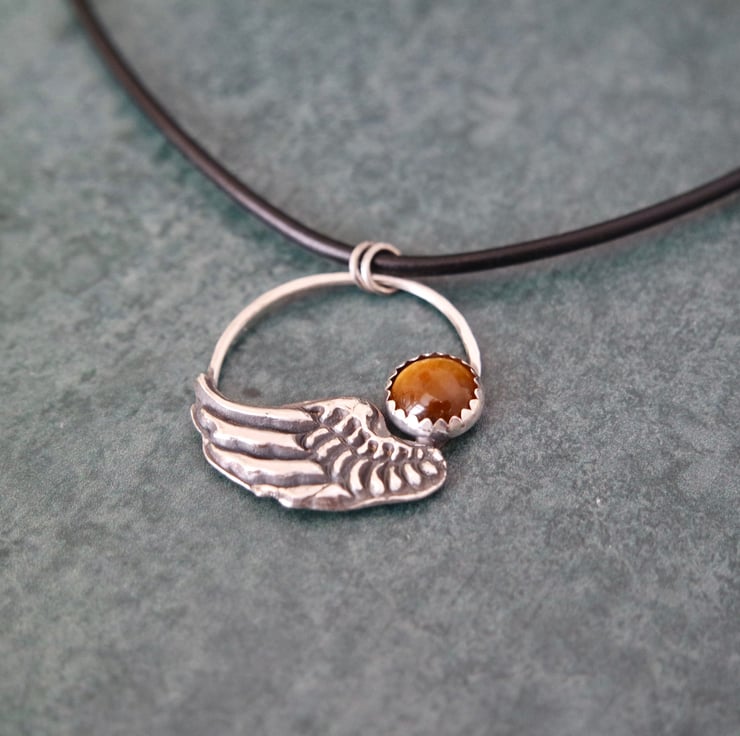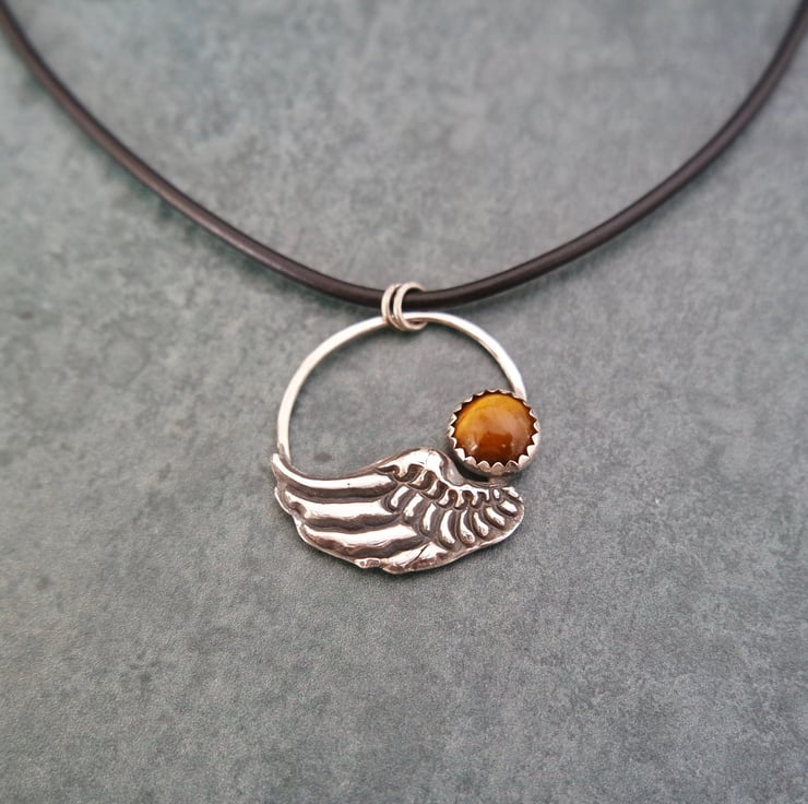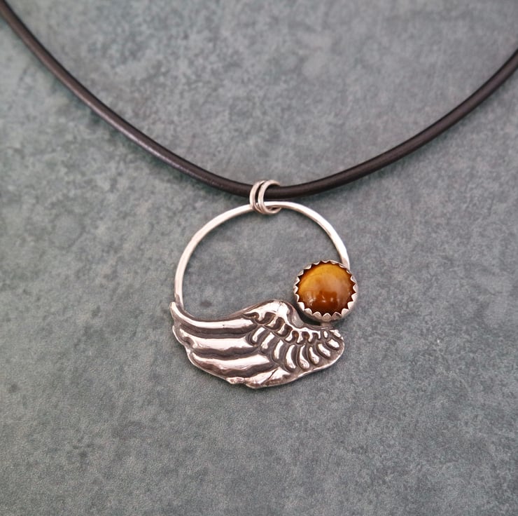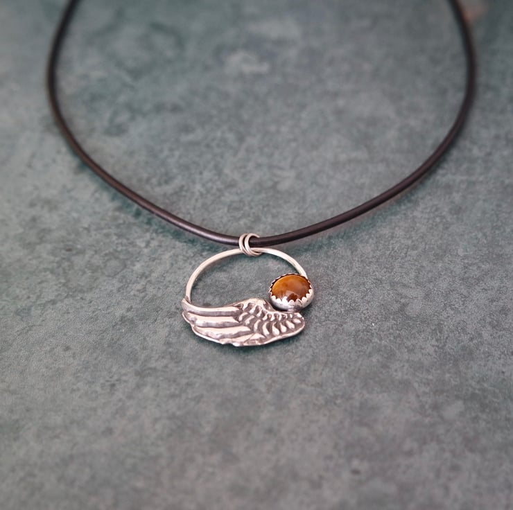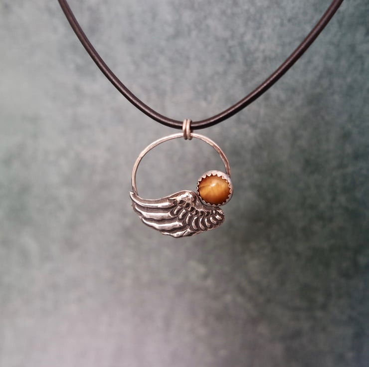 A special, one of a kind angel wing pendant with an angel wing and a tigers eye gemstone. Angel wings have different meanings in different cultures. Religion, remembering, messengers between worlds are just some of them. To me wings symbolize mostly freedom and peace.