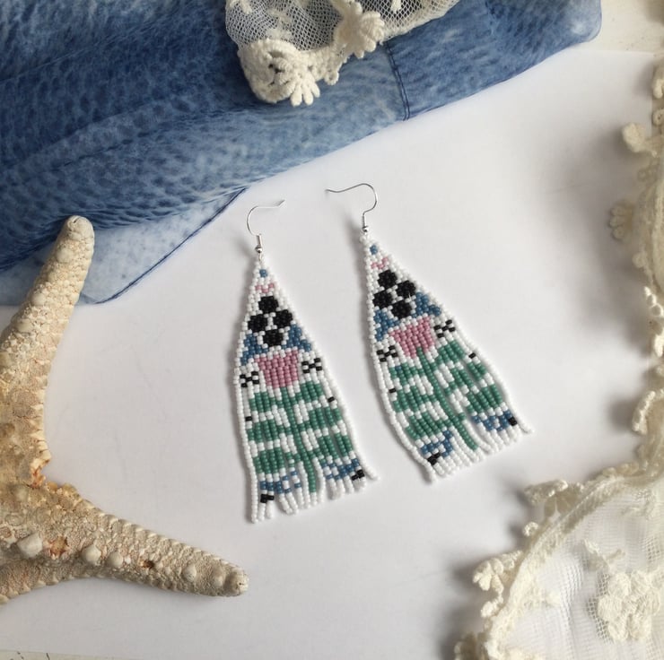 Beautiful unique folk art flower fringe earrings hand threaded using high class quality Miyuki seed beads from Japan.