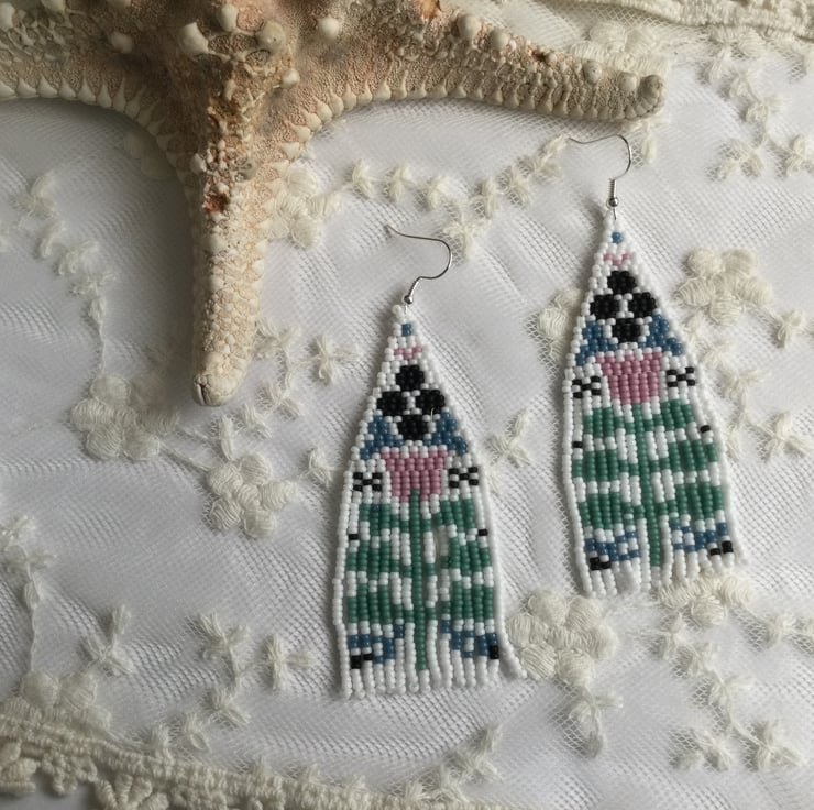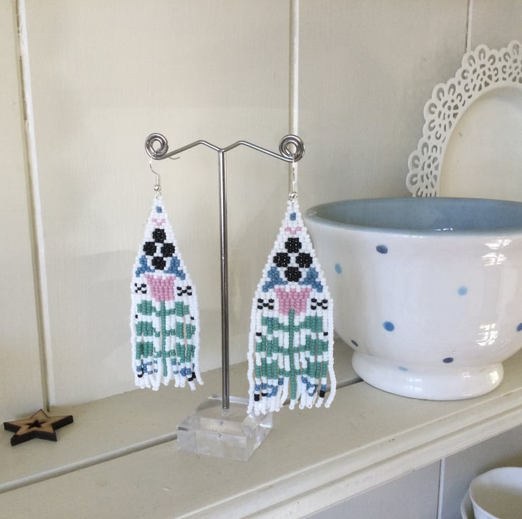 Beautiful unique folk art flower fringe earrings hand threaded using high class quality Miyuki seed beads from Japan.