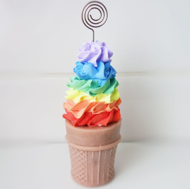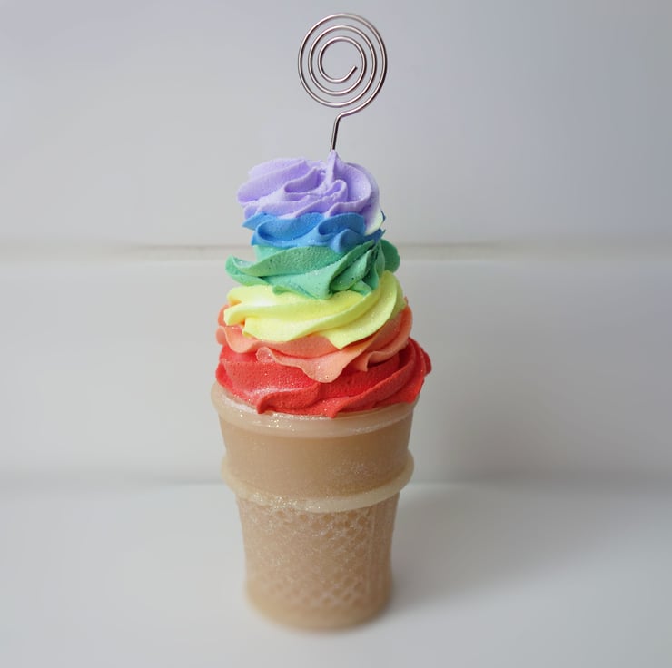 One single Rainbow fake ice cream cone card/photo/memo holder. Crafted from wax and plaster with a metal spiral holder, sprinkled with glitter for added twinkle.