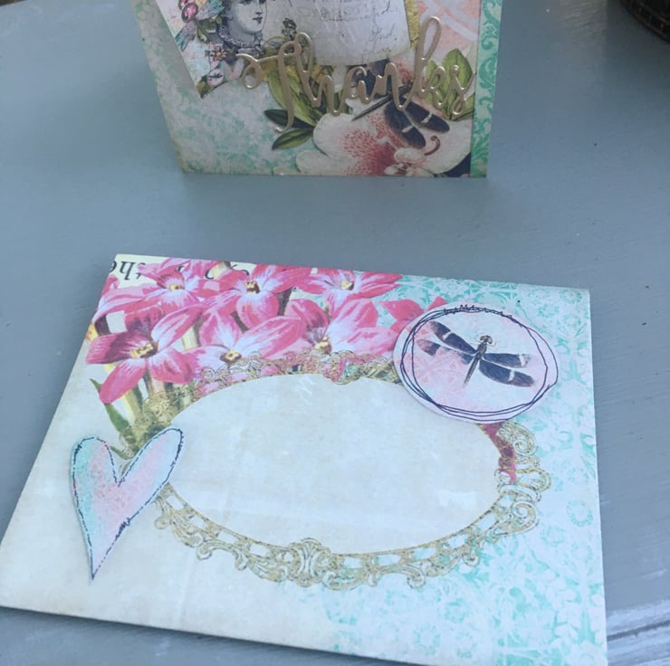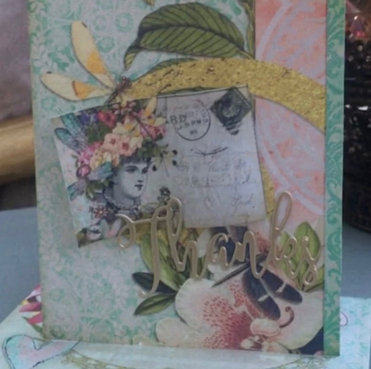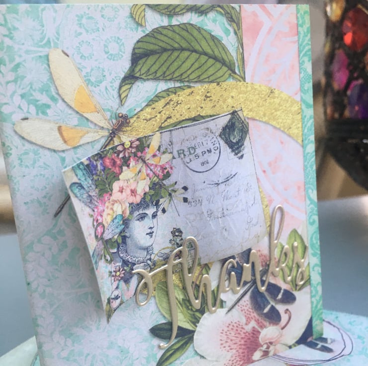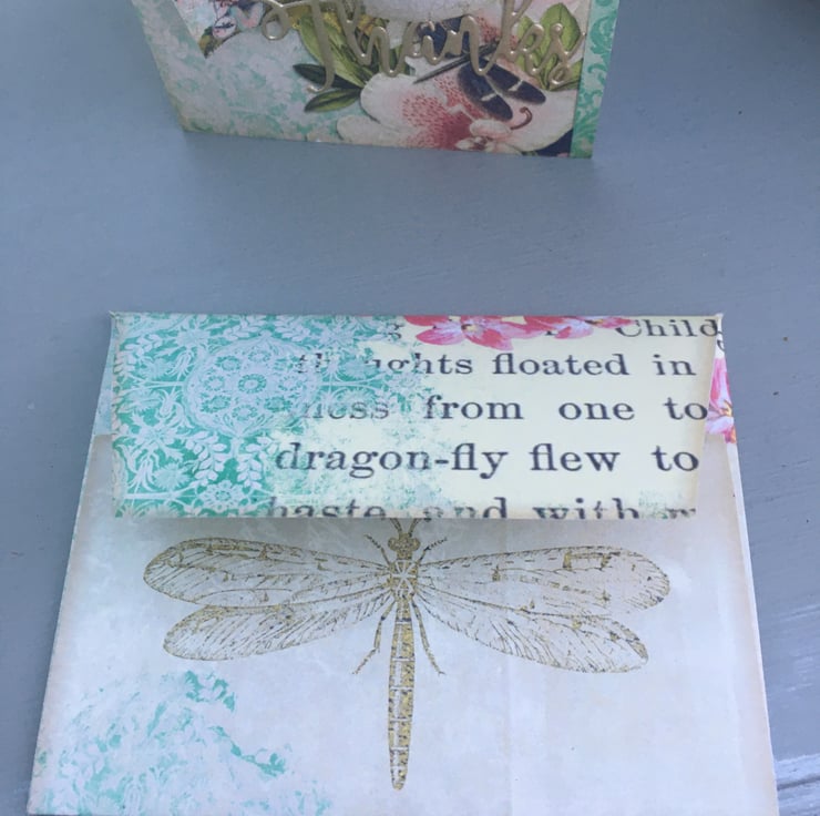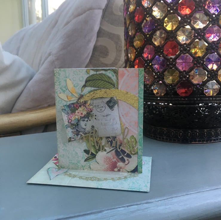 Saying thank you is such a lovely thing. It doesn't have to be for anything huge, sometimes it's just for being there. This neat little card is just enough for a few words. It is 10x8cm in size so quite small but it packs a punch in detail. The card is decorated very much in a botanical style with foliage and orchids. A mini postcard is on the top, curled for some detail and dimension. A lady with a floral hat adds some glamour to the design. A diecut Thanks makes the greeting and is cut out of mat gold cardstock. Inside the card has Thanks as a greting in matching paper. The card comes in a matching envelope with lilies, dragonflies and hearts decorating it.