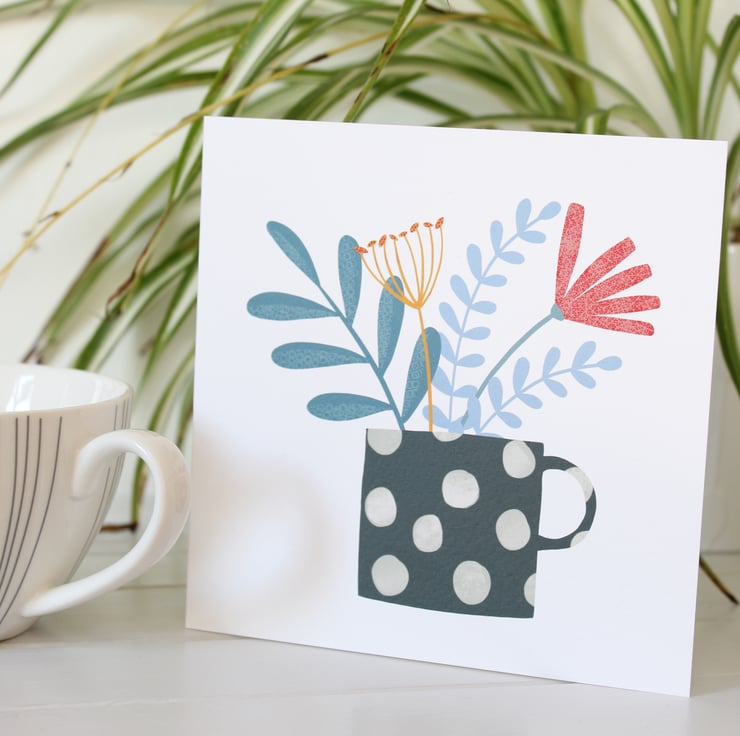 A blank greetings card featuring my Black Spot Flower Vase illustration.