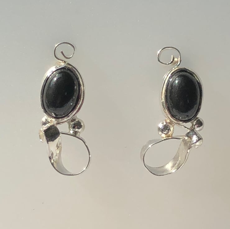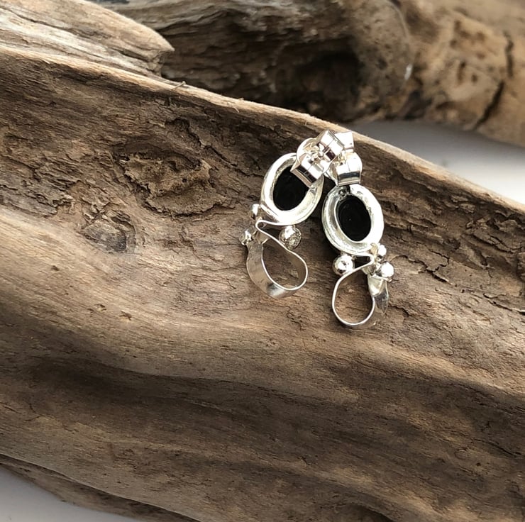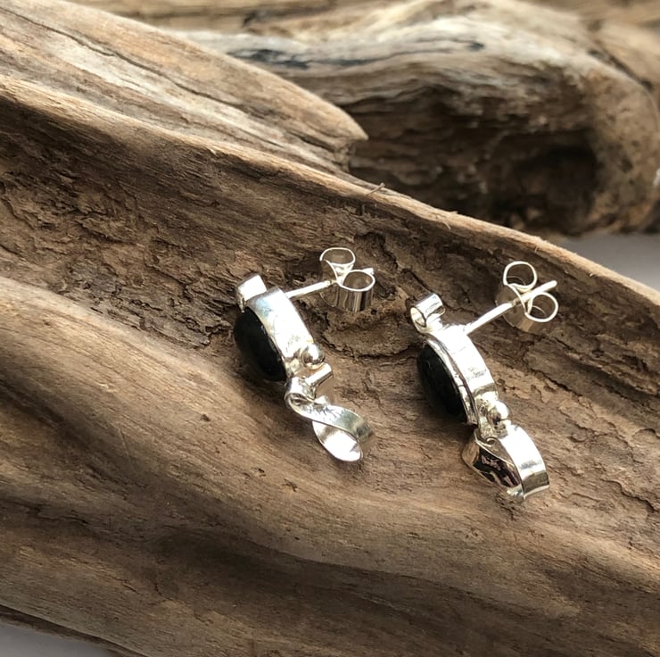 Solid sterling silver curl design studs set with 8x6mm oval black onyx.