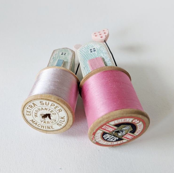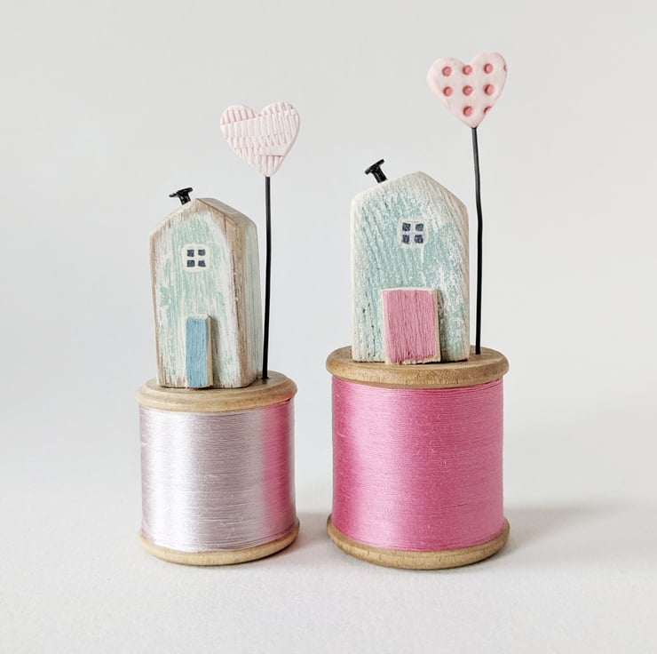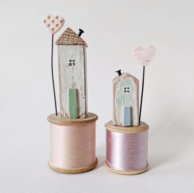 A hand painted little wooden house sits on a vintage bobbin. A patterned and painted clay love heart stands beside it.