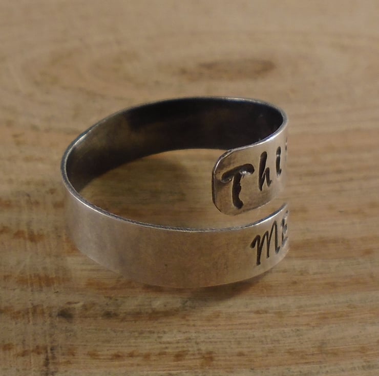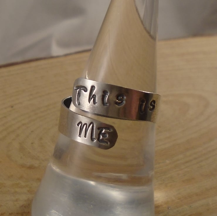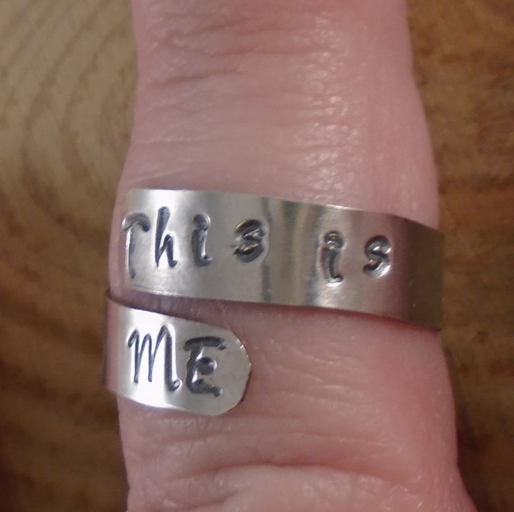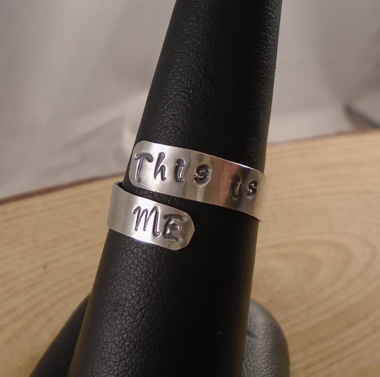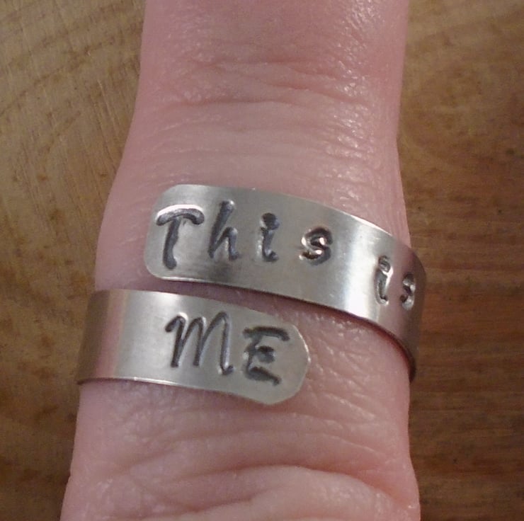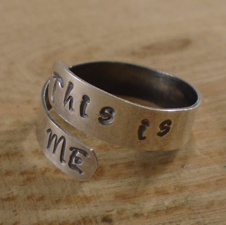 A positive, inspirational ring, hand made from sterling silver. A strip has been hand pierced from a sheet of silver. It has then been hand stamped on either end with the words 'This is Me.' The strip has then been bent around a mandrel to form the ring, and oxidised to blacken the wording.