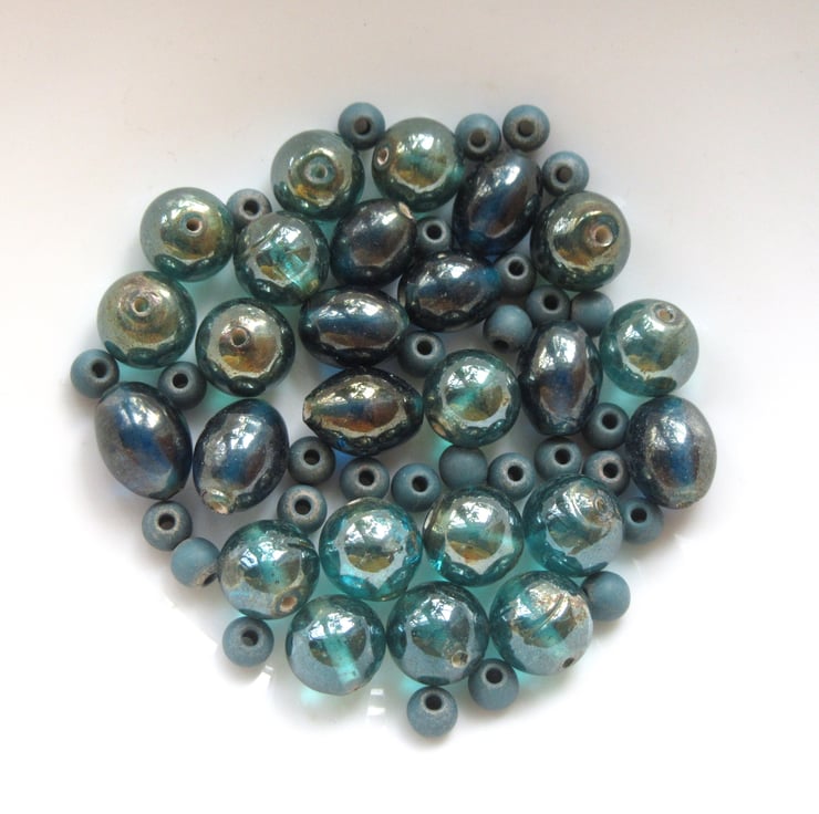 A mixture of teal / blue coloured beads with a silvery shimmer or a matt surface.