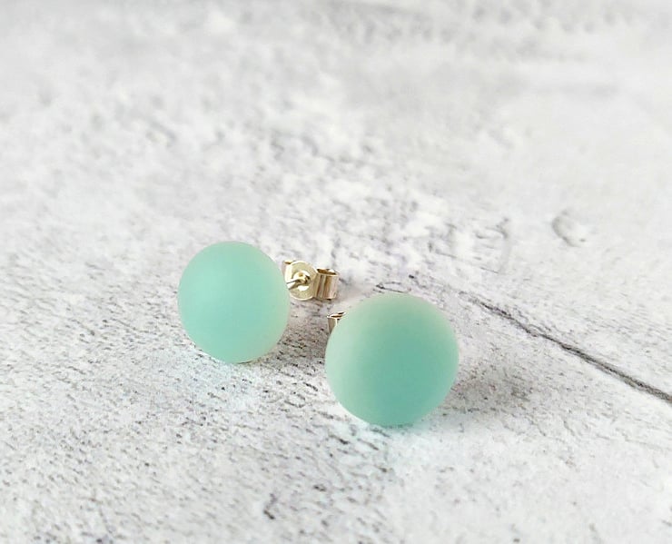 A pair of handmade fused glass stud earrings in a soft seafoam green, with a smooth matt finish and sterling silver fittings.