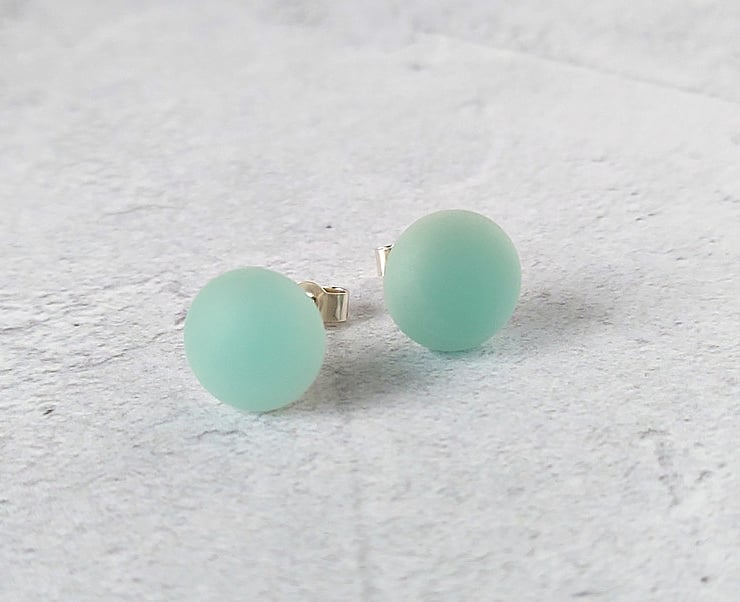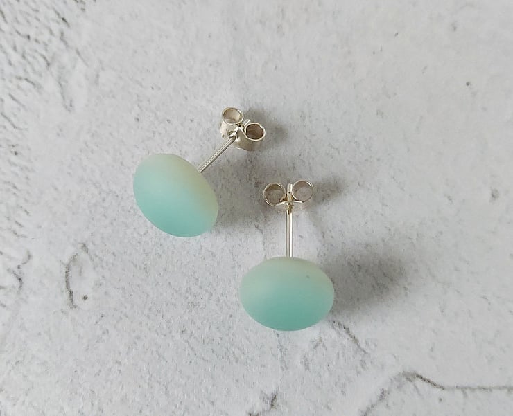 A pair of handmade fused glass stud earrings in a soft seafoam green, with a smooth matt finish and sterling silver fittings.
