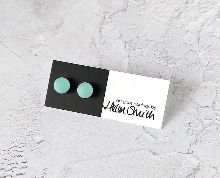 Stud earrings in pale seafoam green matt fused glass with sterling silver fittings, handmade by me in my home studio on the Wirral peninsula, NW England and presented on my signature card.