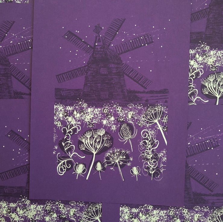 It is hand-printed by myself using System 3 inks on Royal Purple 300gsm Canford Card. Please note that the shade of purple is represented more accurately in the second picture - difficult to photo!
