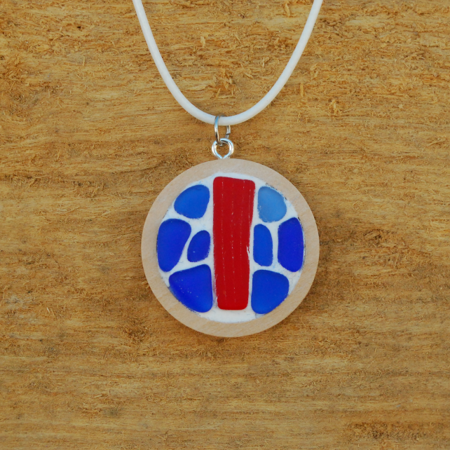 This eye-catching pendant feature rare red beach glass in the centre, with blue at the sides. The blue glass has come from old poison and medicine bottles. We have tumbled the glass so it is smooth and finely frosted. The back of the pendant is natural wood.
